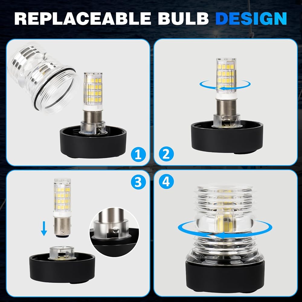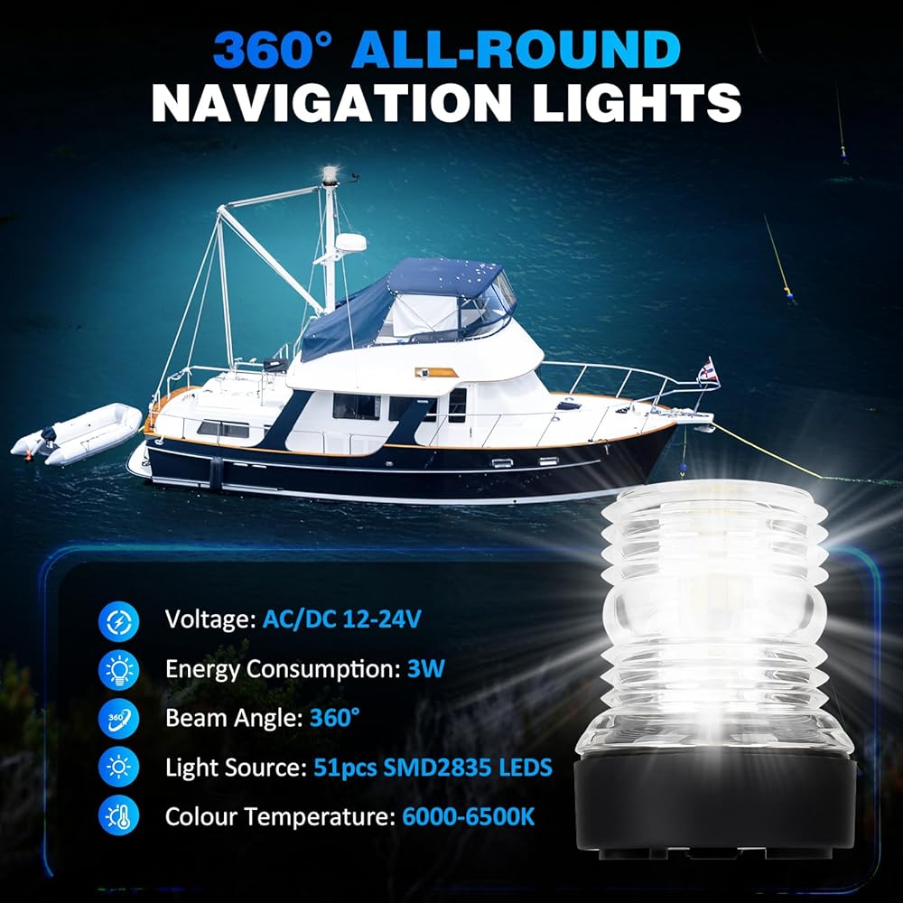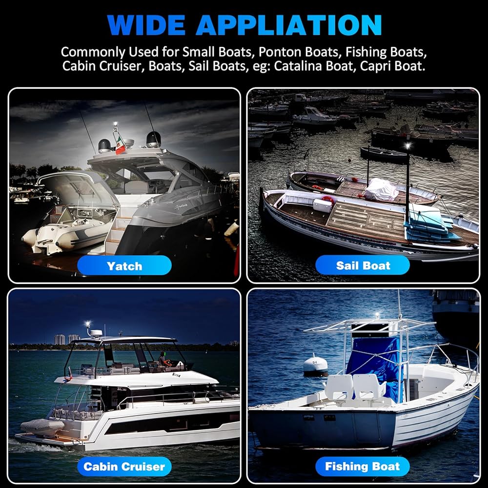 • مواد من الدرجة البحرية الشاملة 12-24V: مواد من الدرجة البحرية تقاوم بيئات المياه المالحة القاسية. متوافق مع معظم الأنظمة الكهربائية 12-24 فولت AC/DC - مثالية لقوارب شراعية Catalina/Capri و Yatch والقوارب الصغيرة