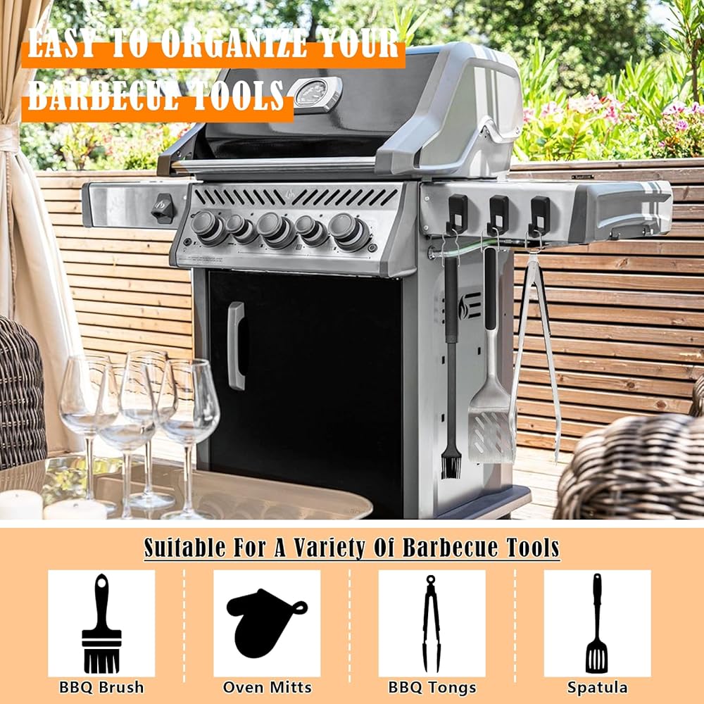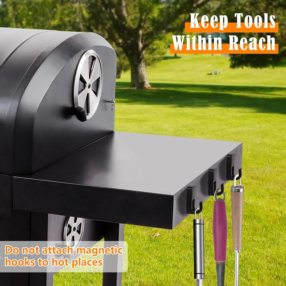 • حافظ على الأدوات في متناول اليد: مع إكسسوارات خطافات الشواية المغناطيسية هذه ، يمكنك تعليق أدوات الشواء مثل ملقط الشواء ، وفرش الشواء ، ومقاطع الشواء ، وملاعق الشواء بجوار شوايةك ، مما يجعلها مريحة للوصول إليها بسهولة أثناء الشواء ، وبالتالي تحسين كفاءة الشواء الخاصة بك