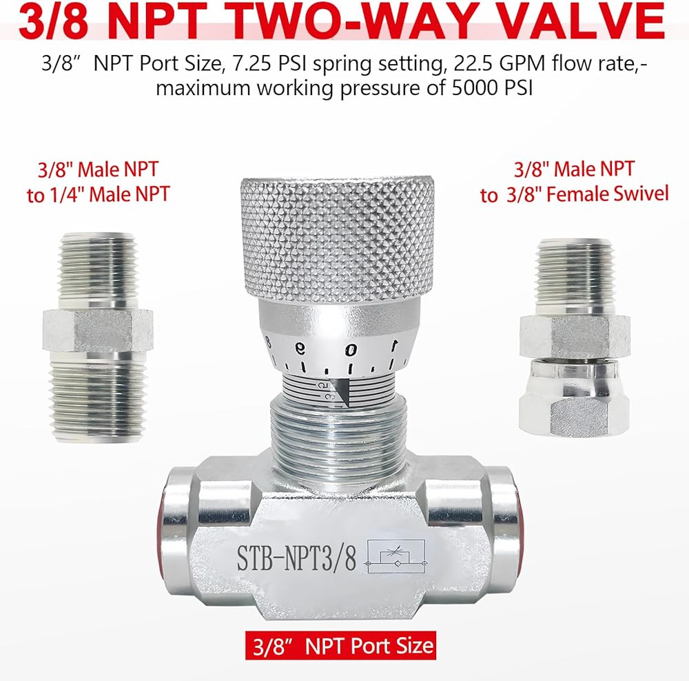 SPECIFICATIONS: 3/4" Hydraulic Control Valve has a carbon steel body with 3/4” NPT Port Size, 7.25 PSI spring setting, 46 GPM flow rate, and maximum working pressure of 5000 PSI. Graduated knob and graduated spindle to accurately control flow.With 2 Pcs 3/4" x 3/4" NPT Male Thread Pipe Adapter.