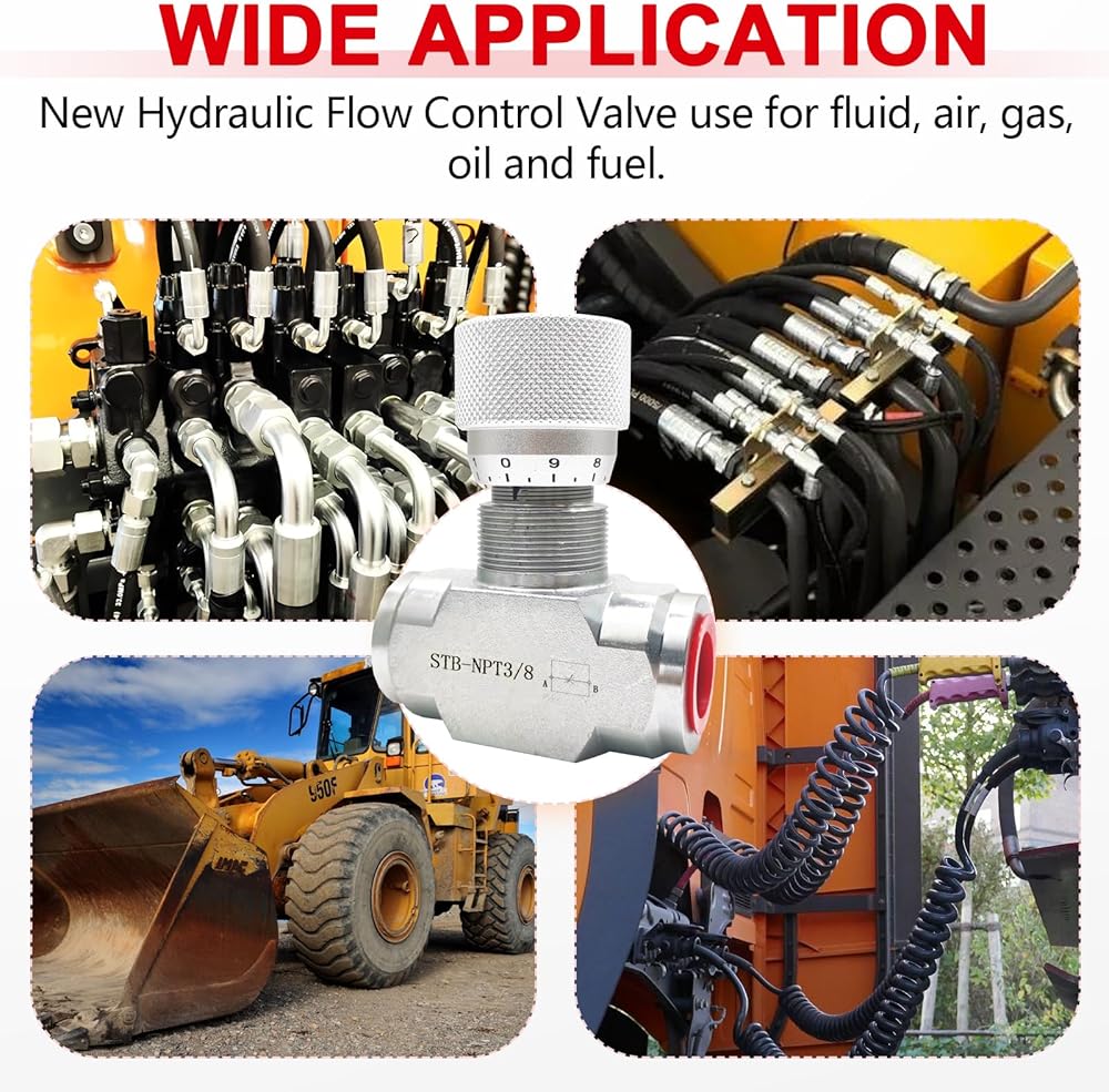 APPLICATION: New Hydraulic Flow Control Valve use for fluid, air, gas, oil and fuel. Works for multiple applications and industries, including hydraulics, pneumatics, plumbing, etc.