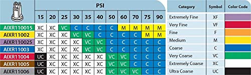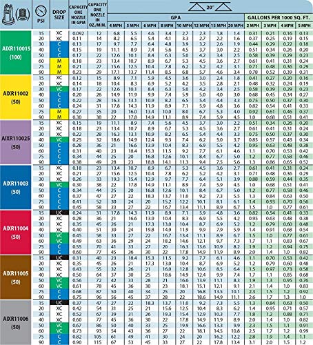 See Chart in Pictures for PSI Ratings! AIXR11002-VP Air Induction Flat Spray Nozzle. 110° wide, tapered flat spray angle with air induction technology offers better drift management. Made of a two-piece UHMWPE polymer construction with VisiFlo color-coding. UHMWPE provides excellent chemical resistance, including acids, as well as exceptional wear life. Compact size to prevent tip damage. Depending on the chemical, produces large air-filled drops through a Venturi air aspirator.