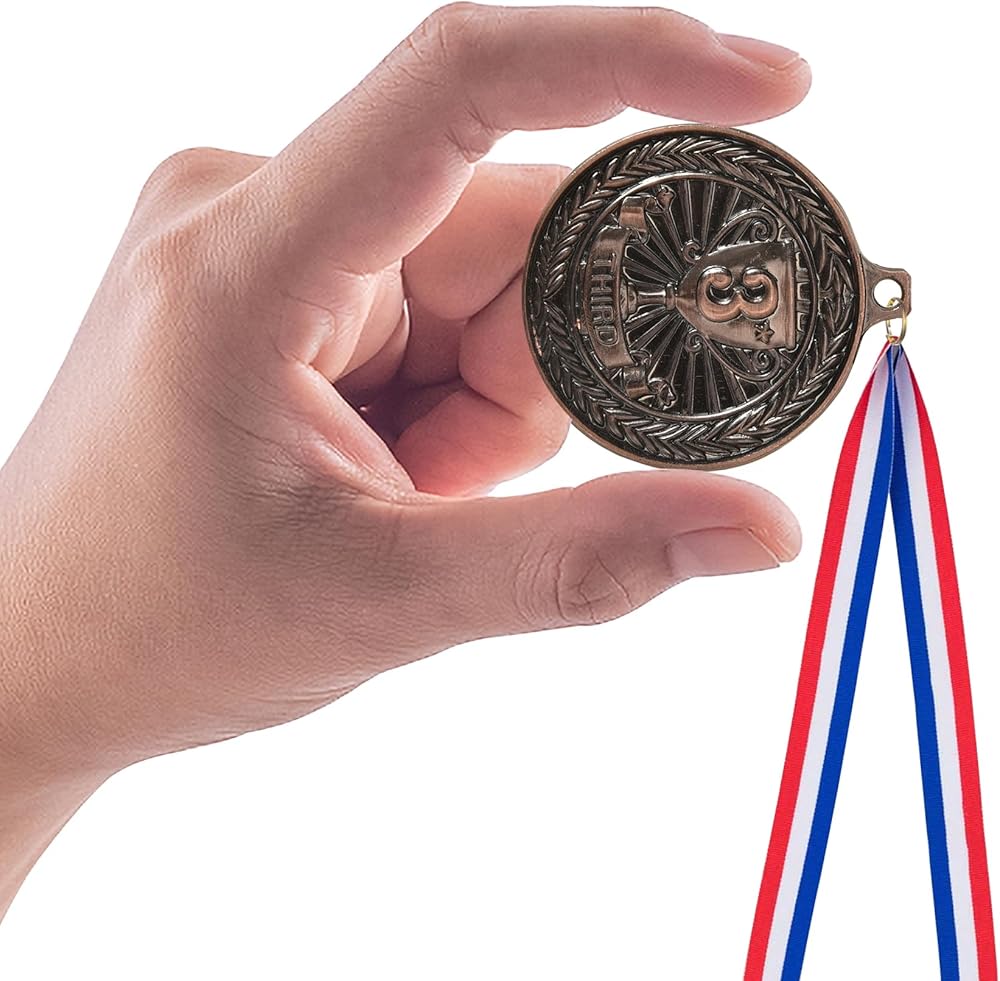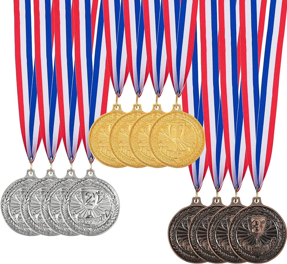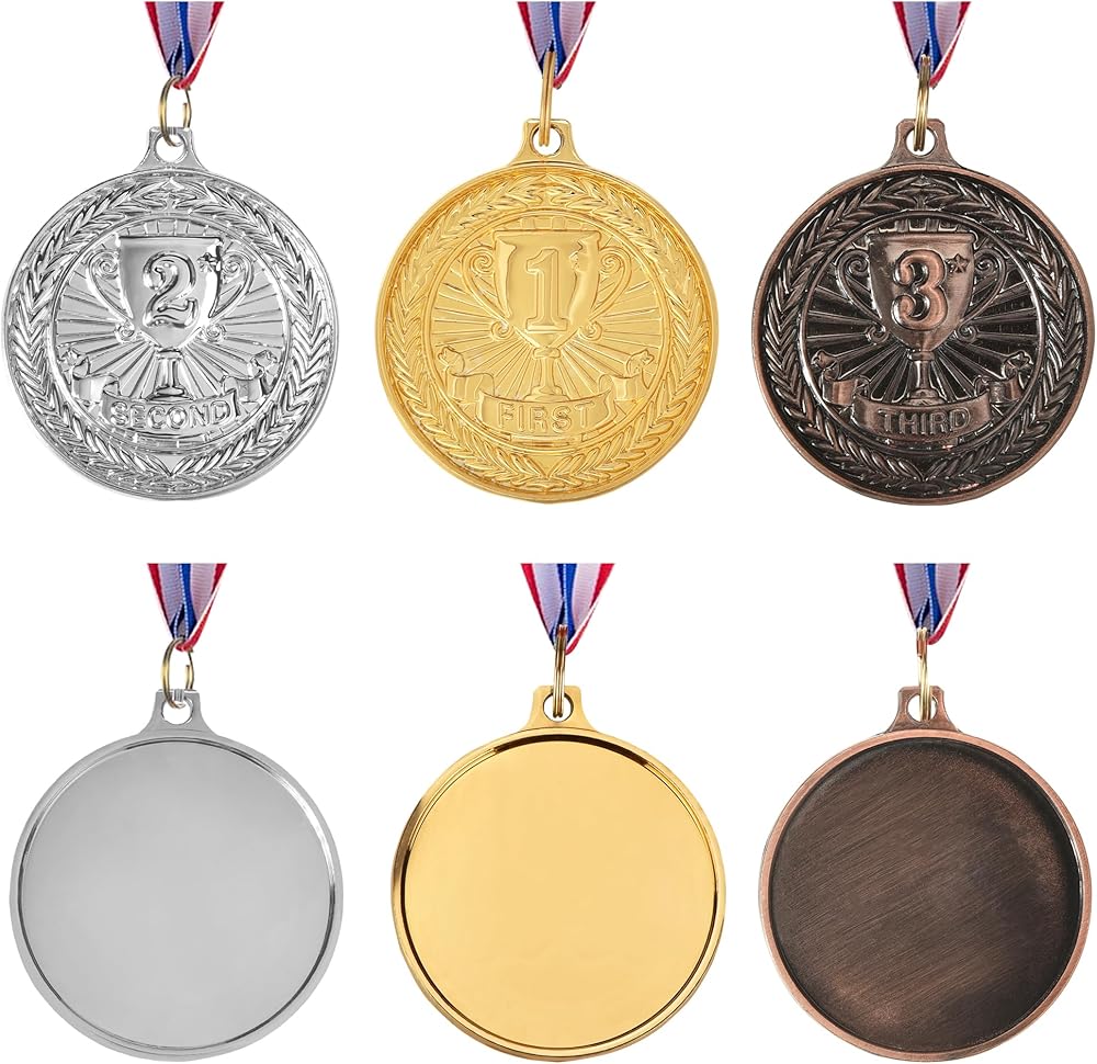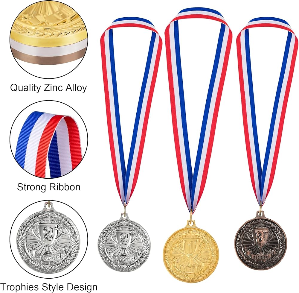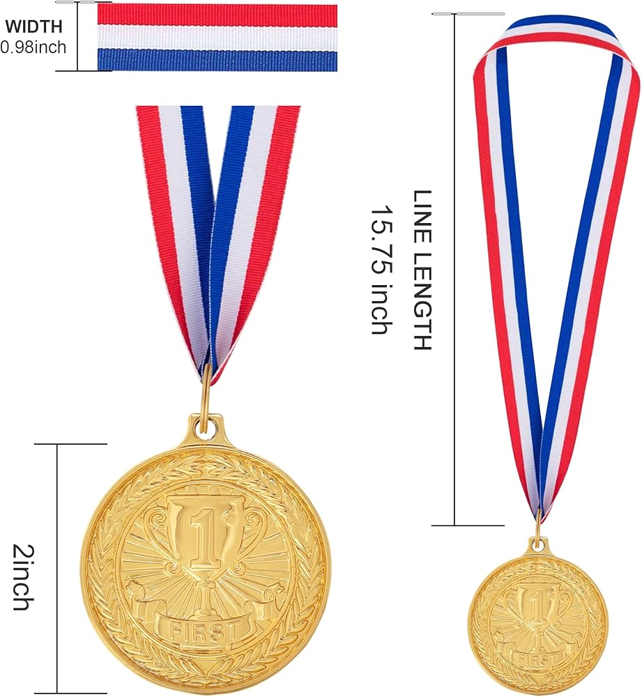 ما تحصل عليه: يتضمن 3 أنواع من الميداليات ، الميدالية الذهبية الأولى ، الميدالية الفضية في المركز الثاني ، الميدالية البرونزية في المركز الثالث ، 4 قطع لكل لون ، ما مجموعه 12 قطعة ؛ جائزة الميداليات تأتي مع شرائط.