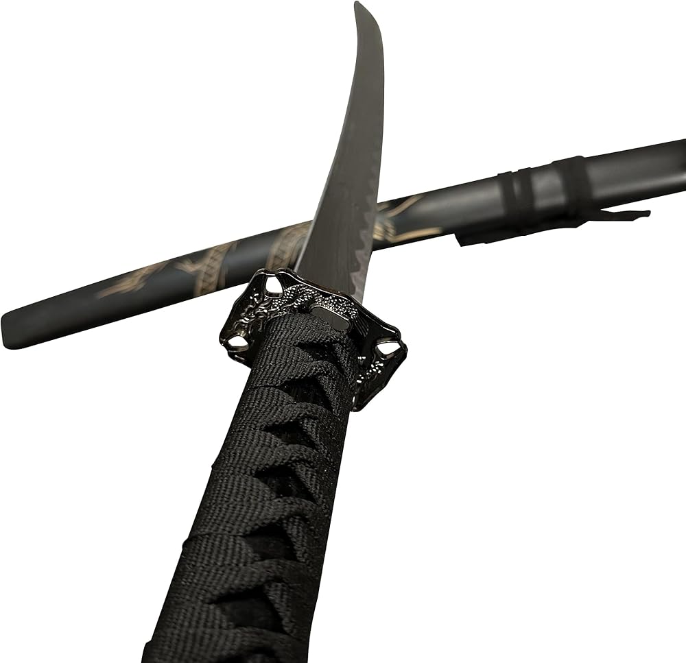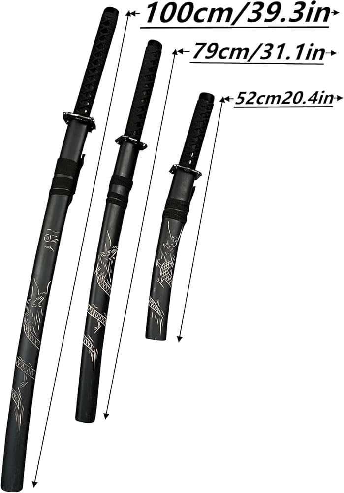 "Samurai Sword Set includes three sizes: 100cm/39.3in (long), 79cm/31.1in (medium), and 51cm/20in (short). Total weight: 3kg/6.6lbs. The blades are made of 1065 steel, and are unsharpened, not suitable for cutting. This set is primarily intended for decoration and training purposes. It makes a perfect gift for friends. The package includes foam padding to prevent damage to the swords. Upon opening the package, there may be some wood shavings on the blade surface; please wipe them off with a clean cloth or tissue."
