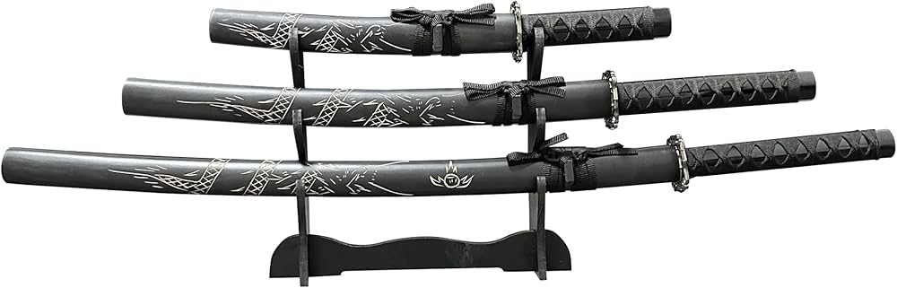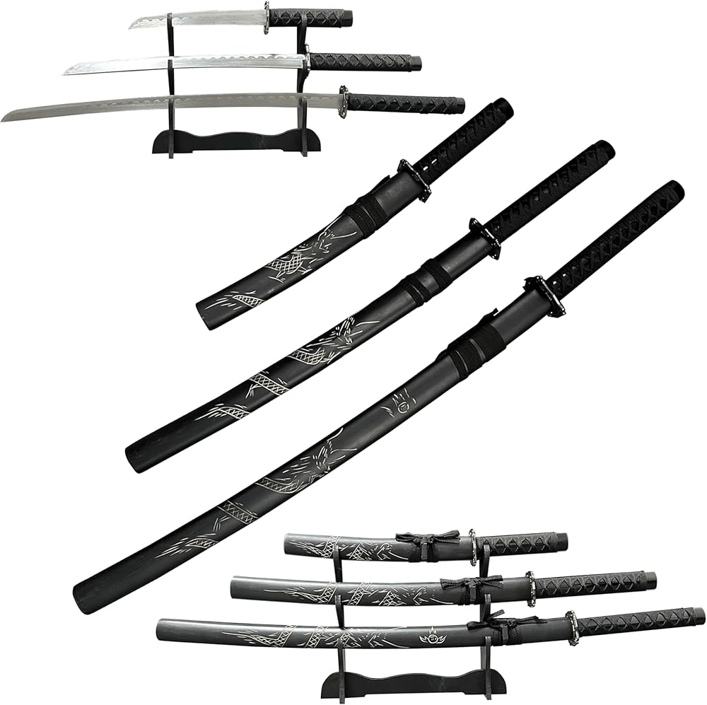 Samurai Sword مجموعة 3 قطع-1095 عالية من الصلب الكربوني-39 "31" 20 "شفرات-كاتانا الزخرفية مع الحامل-الغش الأسود المحفور