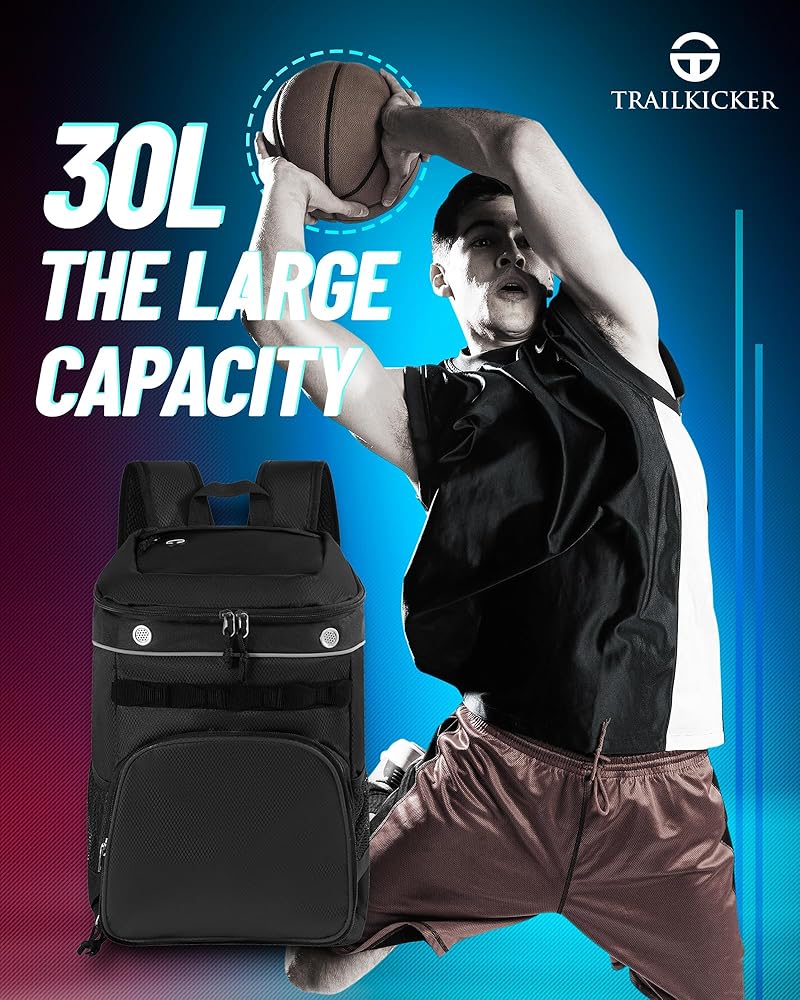 Spacious Capacity – TRAILKICKER basketball backpack has 1x ball compartment (for basketball, soccer, volleyball, football or baseball helmet), 1x main compartment, 1x front zipper pocket, 2x mesh bottle pockets. From court to classroom, it's built for every adventure.