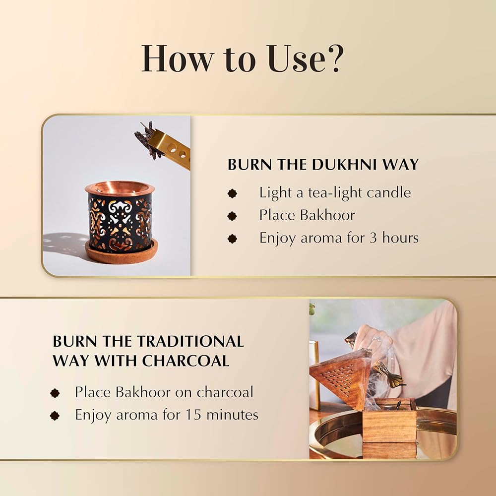 طريقة الاستخدام: يمكن حرق دخاني معطر بالطريقة التقليدية على الفحم. ضع القليل من رقائق خشب المعطر على الفحم الساخن واستمتع بالدخان العطر الذي يملأ غرفتك. سوف يحترق لمدة 15 دقيقة تقريبًا ولكن الرائحة ستدوم لفترة طويلة. تسمح مواقدنا المميزة بطريقة جديدة لحرق رقائق خشب المعطر بسهولة. ما عليك سوى وضع بضع قطع على اللوحة النحاسية وإشعال الشمعة الصغيرة أدناه. نوصي بالشموع الشمعية التي تحترق لمدة تتراوح من 3.5 إلى 4 ساعات.