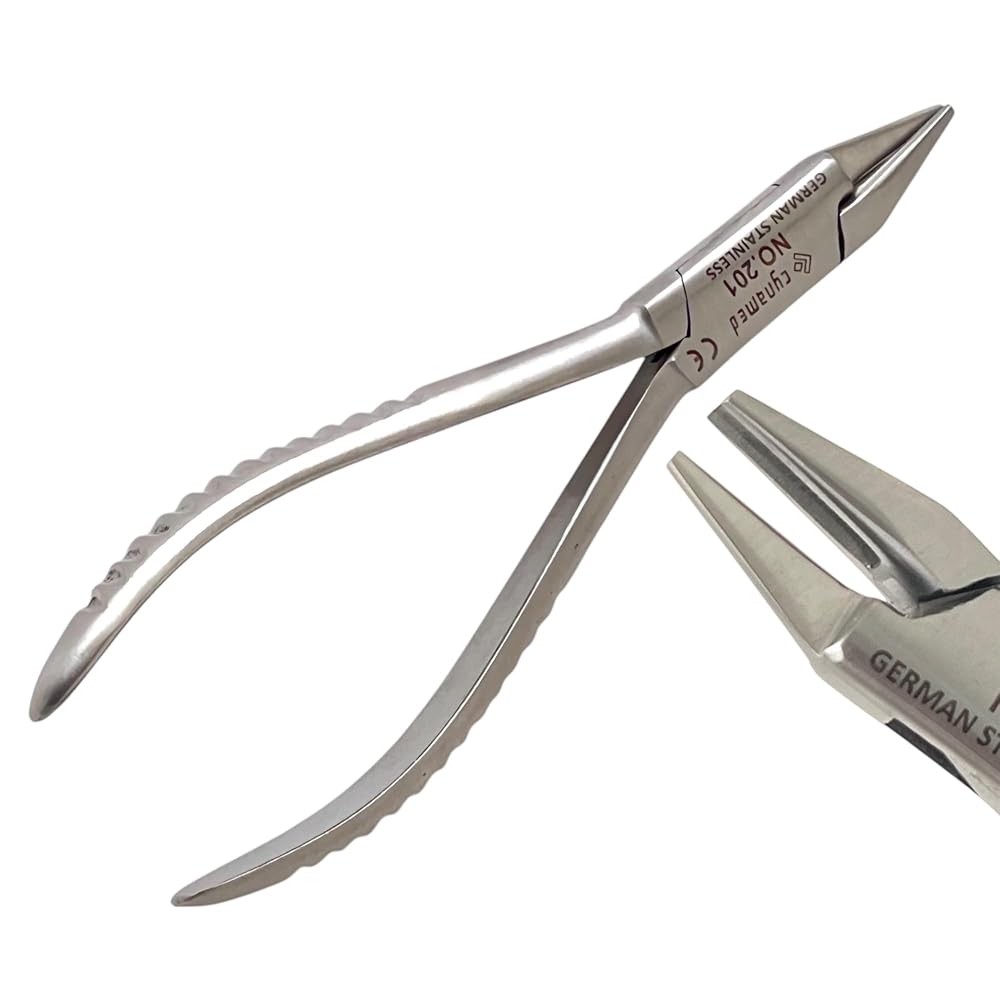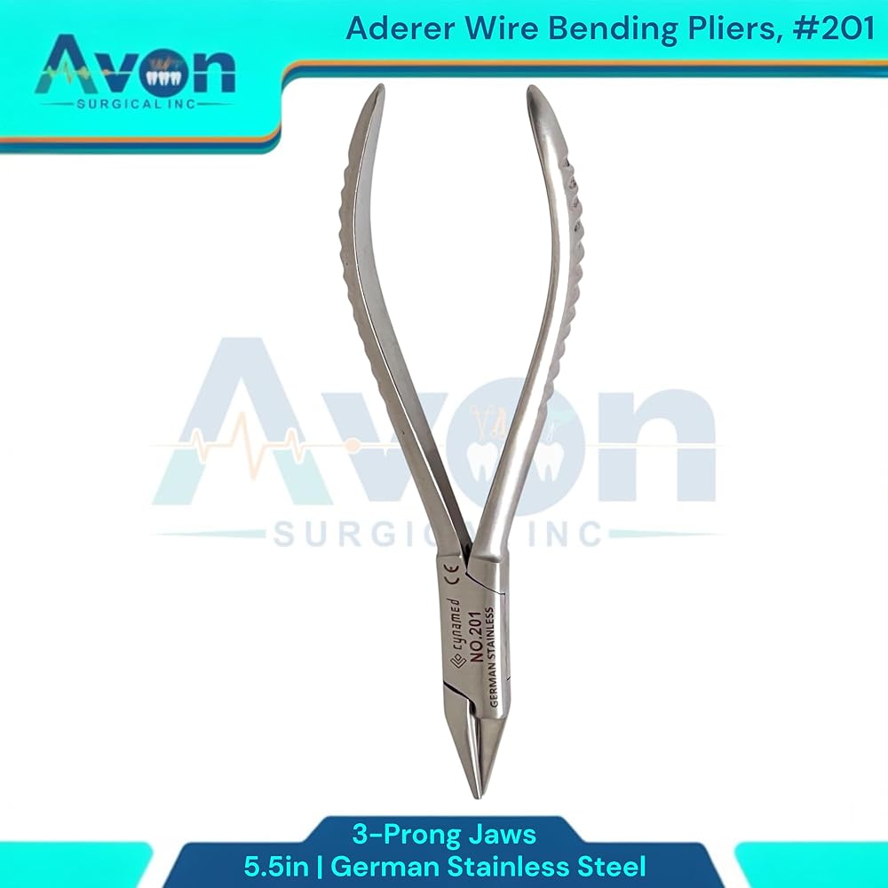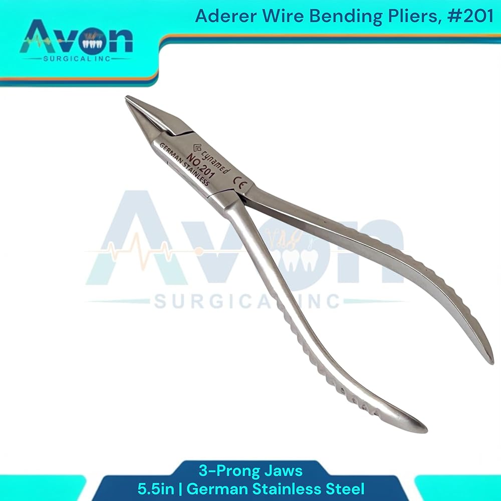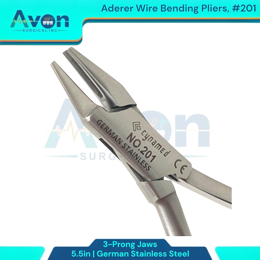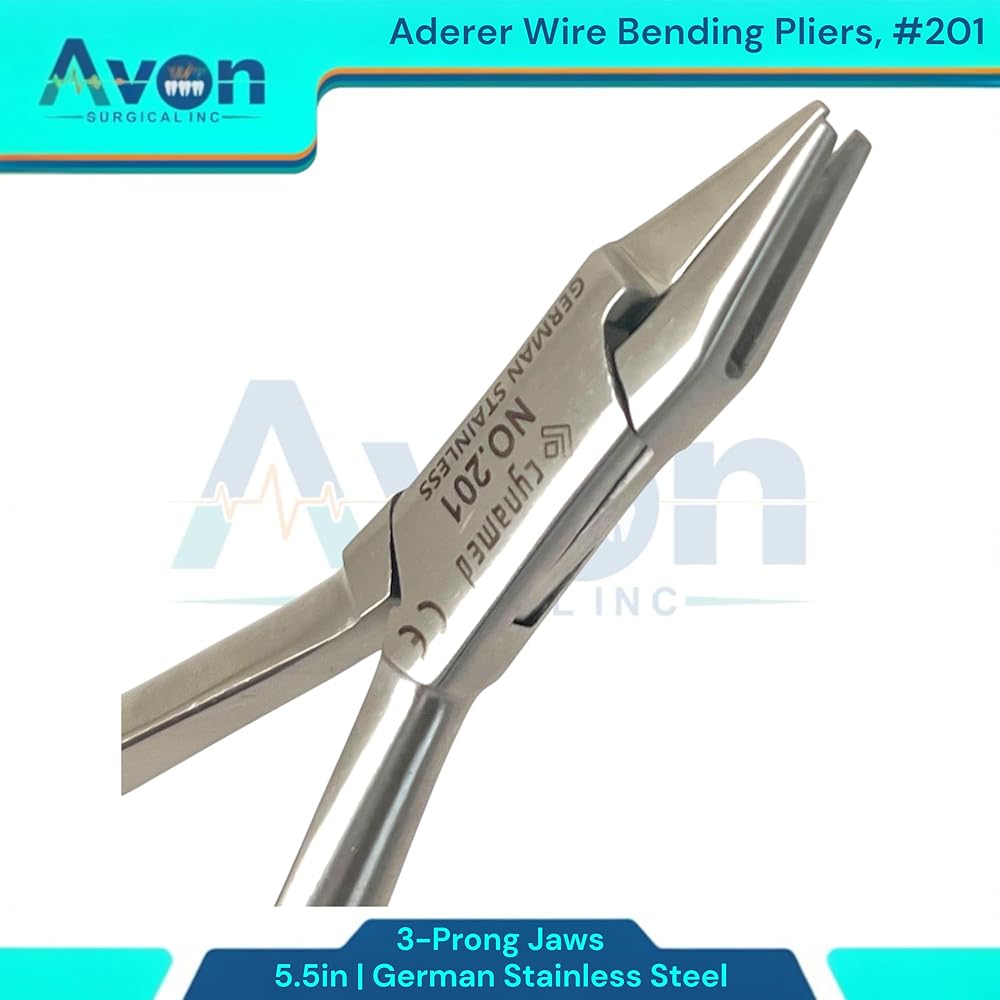 Includes: 1 Each - (#201) 5.5" Aderer Wire Bending Pliers with 3-Prong Jaws, German Stainless Steel. 5.5" Length: The compact 5.5" length offers excellent maneuverability and control, making these pliers ideal for intricate work in confined spaces. This size is a perfect balance between precision and comfortable handling. Unique 3-Prong Jaws: The specialized 3-prong jaw design provides grip on wires of various gauges and materials. This unique configuration allows for precise bending, looping, and shaping, minimizing the risk of wire distortion or breakage. The prongs are meticulously aligned to ensure consistent and accurate bends every time. Ergonomic Handle Design: The ergonomically designed handles provide a comfortable and secure grip, reducing hand fatigue during extended use. This enhances control and precision, leading to improved results. Corrosion Resistant: German stainless steel's inherent corrosion resistance ensures the pliers maintain their integrity and appearance even after repeated exposure to moisture and sterilization processes.