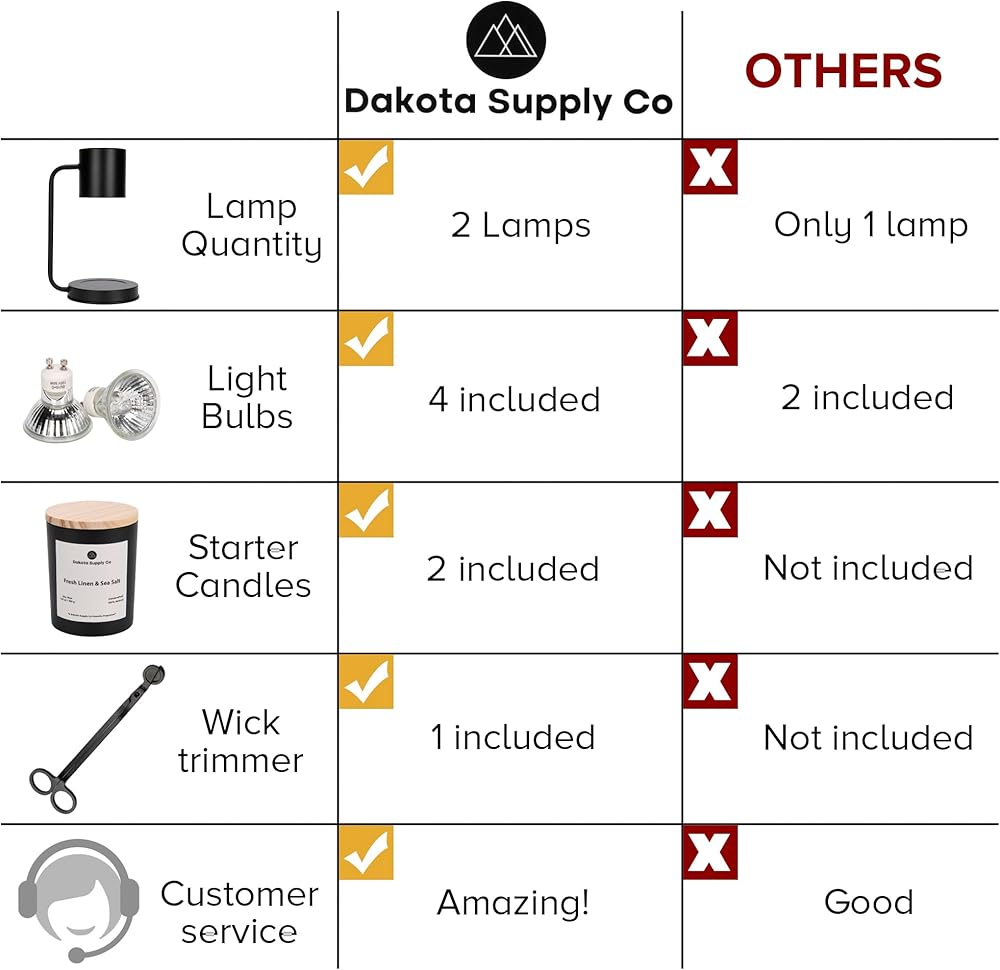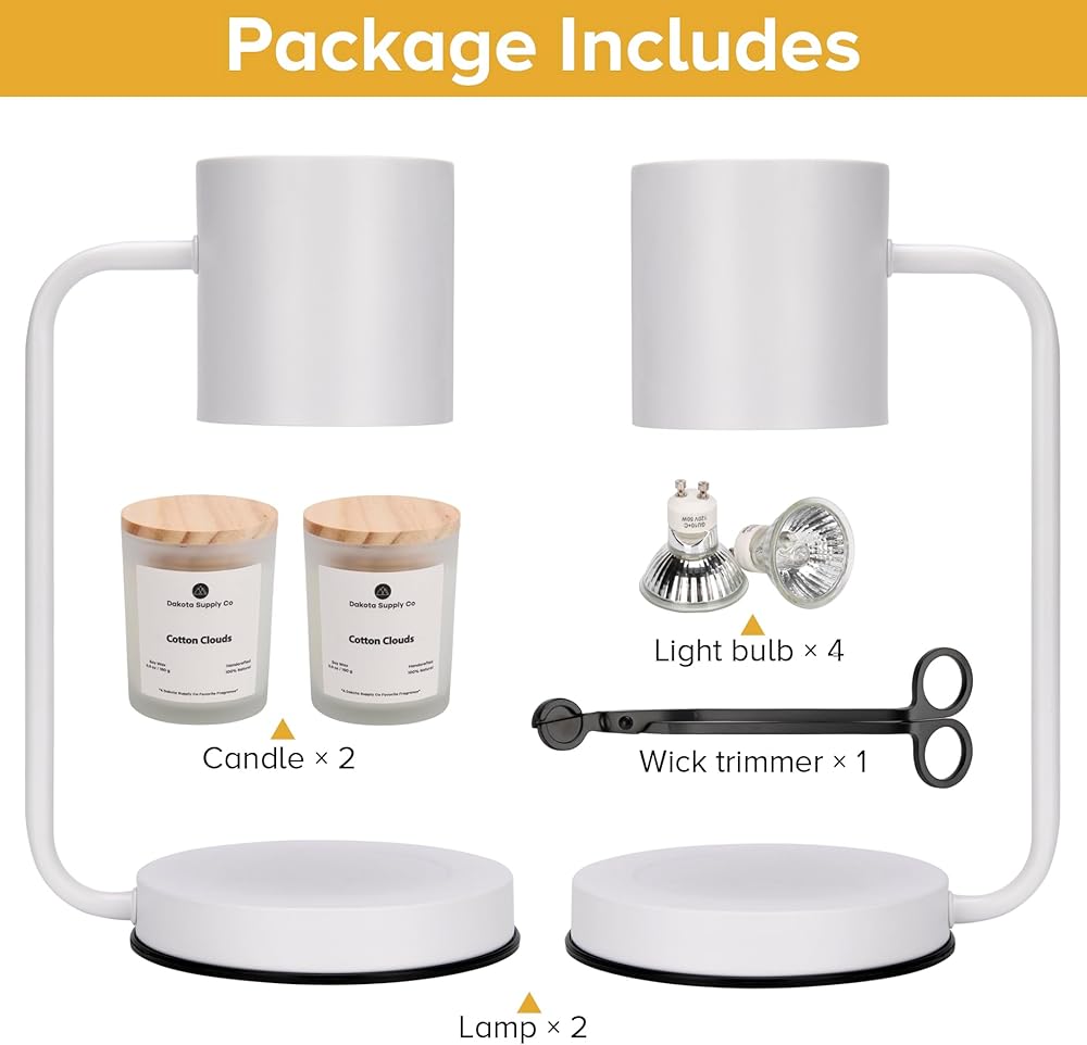 مجموعة كاملة لتدفئة الشموع - انغمس في تجربة الشموع المثالية مع مجموعة مصابيح تدفئة الشموع الخاصة بنا. تشتمل هذه المجموعة الشاملة على مصباحين أنيقين، متوفرين حسب اختيارك باللون الأبيض أو الأسود، مما يسمح لك بمطابقة ديكور منزلك بسهولة. بالإضافة إلى ذلك، تأتي مع شمعتين معطرتين رائعتين، وأداة تشذيب الفتيل، وأربعة مصابيح للمصابيح، مما يضمن حصولك على جميع الضروريات لخلق أجواء مريحة وعطرية.