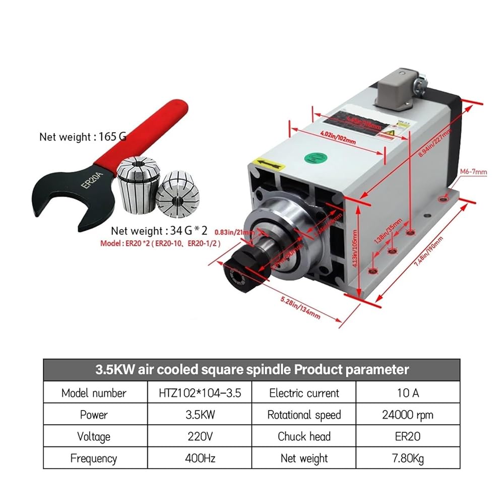 3.5kw محرك المغزل 220V ER20 400Hz 24000RPM + ER20A WRENCH + 2 PCS ER20 Chuck 1/2 inch 10mm