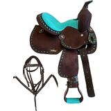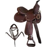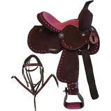 12" YOUTH Synthetic Western Pony/Horse Saddle FEATURES: 12" Color Suede Seat, Skirt: 20.5"L x 21" W, Pommel: 9", Cantle: 3", Horn: 1.5", Gullet: 5", Stirrups: 26"- 29" Length, Made on a Sturdy Fiberglass tree. SEMI Quarter Horse Bars. Matching Pony Size Headstall & Breastcollar Set is included.