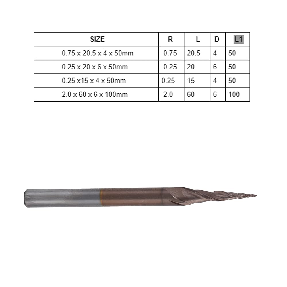 Fafeicy Cone End Mills Tungsten Steel إزالة شريحة ممتازة Long Life Surface Pintt Engrading CNC Acrylic (R0.25*15*D4*50)