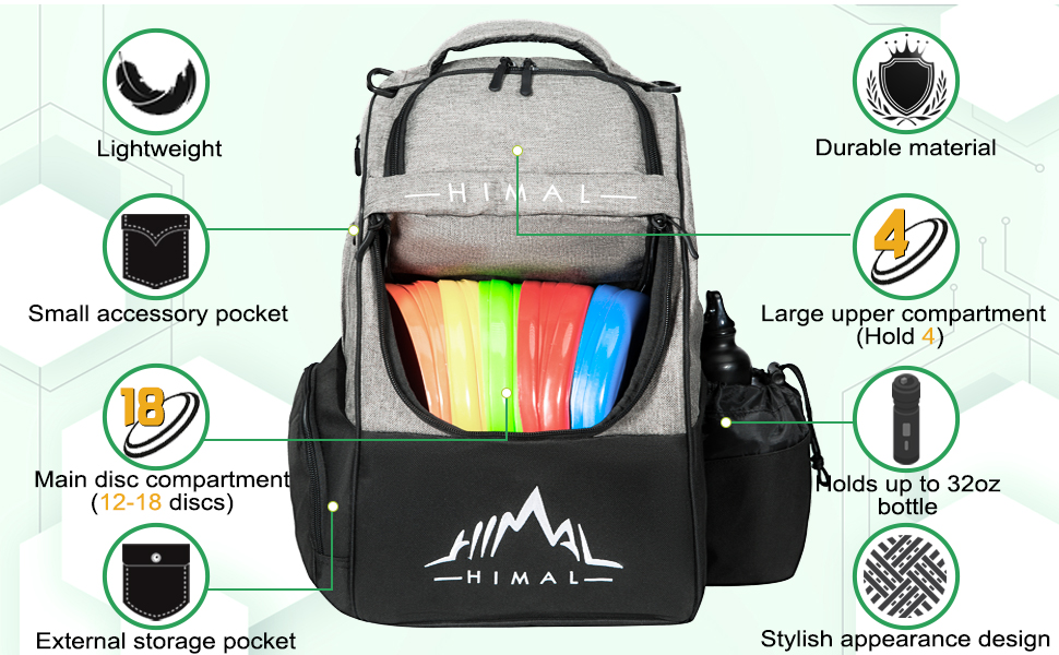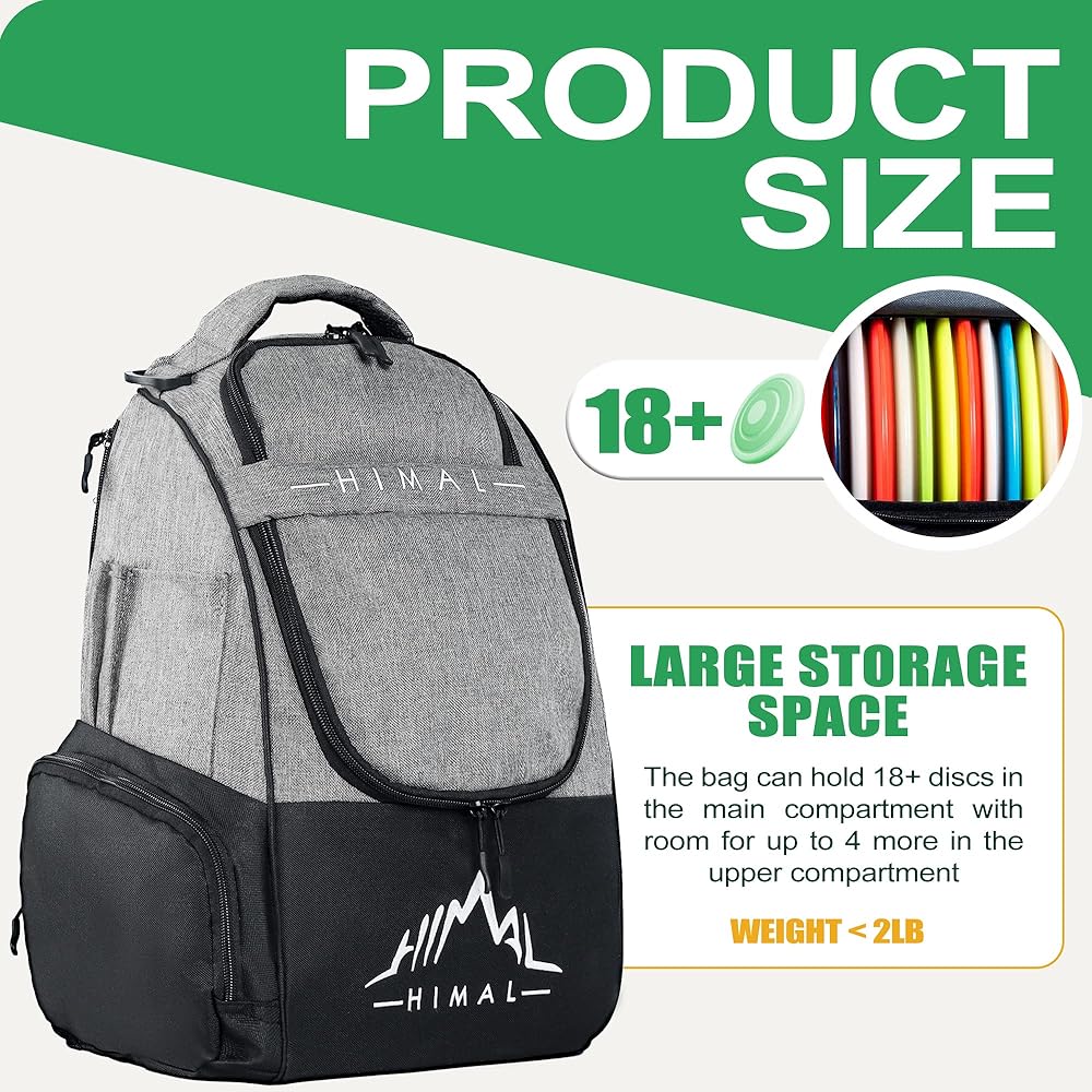 【Ample Storage Capacity】The disc golf bag holds 18+ discs in the main compartment, with space for 4 more in the upper section, perfect for disc golf players