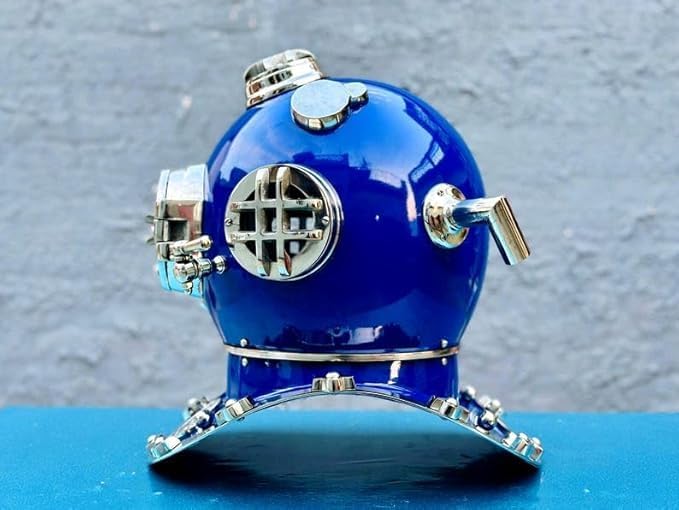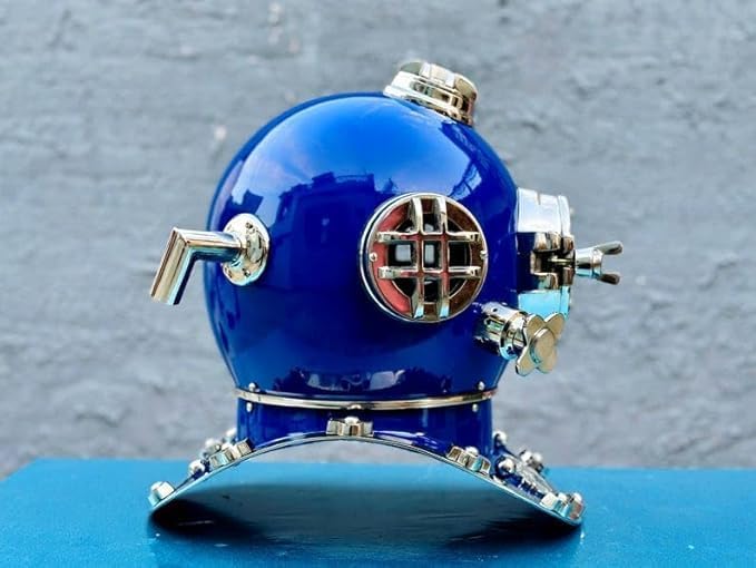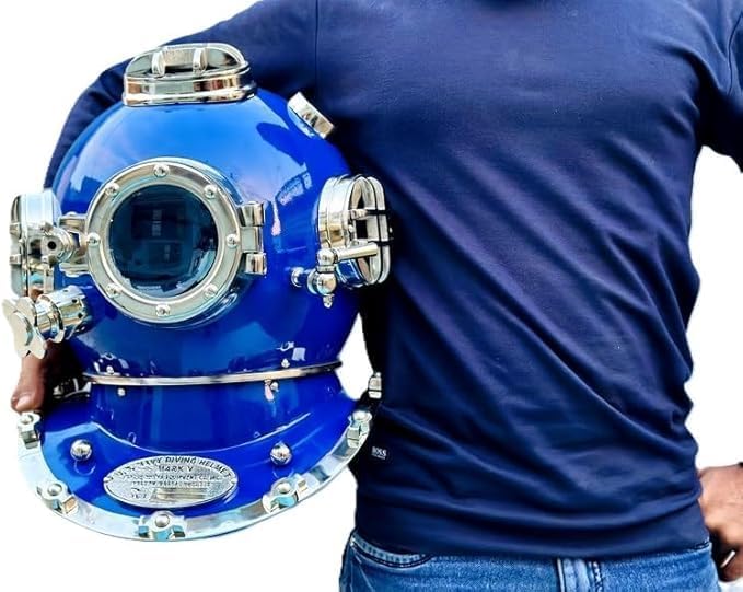 Mark V diving helmet used by the US Navy, this full-size 18-inch replica is an impeccable reproduction of the original, preserving its timeless appeal. Premium Craftsmanship: Handcrafted with precision, the helmet features a durable copper finish with vintage patina, showcasing exquisite detail and robust construction. Authentic Details: Complete with glass viewports, brass accents, and riveted seams, this helmet stays true to its historical roots while delivering a striking aesthetic. Exclusive Collectible: Ideal for collectors, diving enthusiasts, and history buffs, this helmet makes a bold statement as part of any nautical or vintage décor. Versatile Display: Whether showcased in a study, office, or living room, it serves as a centerpiece that sparks conversation and admiration.
