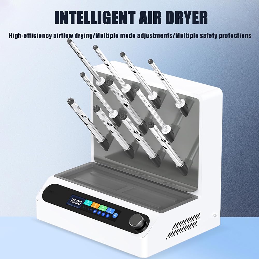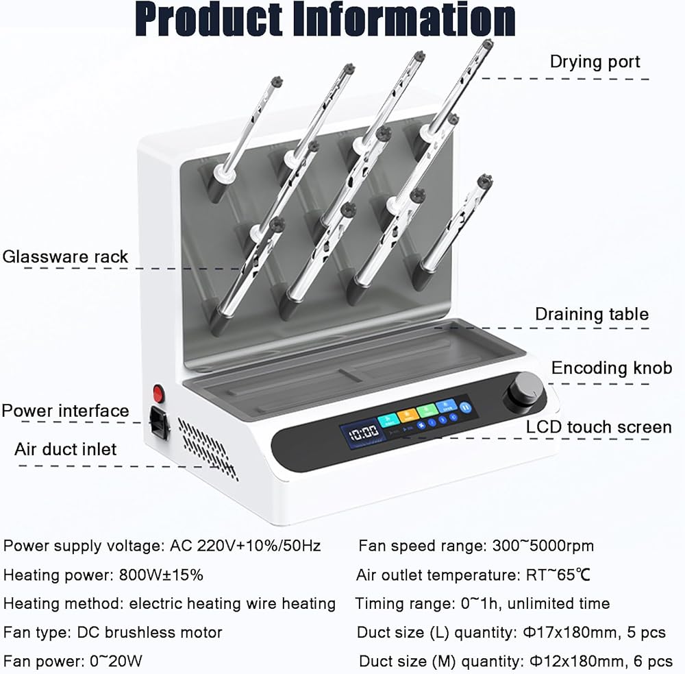Intelligent Airflow Dryer】This smart airflow dryer uses a DC brushless motor, the outlet air temperature RT~65℃, the fan speed range is 300~5000 RPM, and the heating power is 800W. It can quickly heat and dry glassware, with low power consumption and more energy saving.