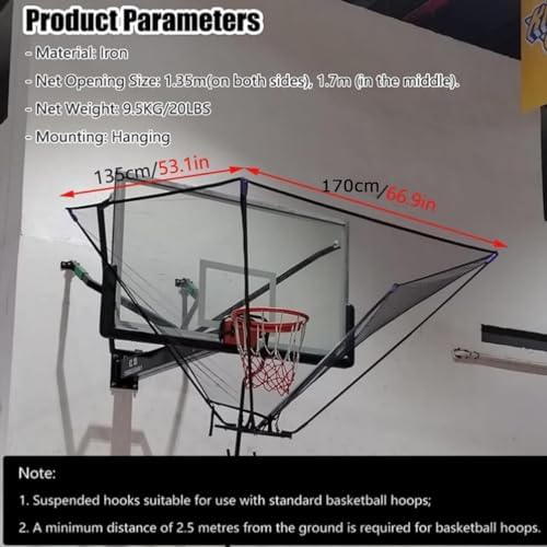 Introducing our Metal Basketball Return Net, a must-have training accessory for basketball enthusiasts! Crafted from a robust iron frame, this durable return net is designed to withstand the powerful impacts of basketballs, making it perfect for both indoor and outdoor use. **Product Specifications:** - **Material:** Sturdy Iron - **Mesh Size:** 1.35m (sides), 1.7cm (middle) - **Net Weight:** 9.5kg (20lbs) - **Installation Method:** Easy Hanging **Key Features:** - **Long-lasting Durability:** Engineered to resist cracking and breaking, ensuring reliable use throughout various seasons. - **Effortless Setup:** Simple assembly and disassembly without the need for tools, allowing for quick installation and storage. - **Perfect for Gifting:** An excellent choice for Christmas or special occasions for any basketball lover. - **Versatile Compatibility:** Designed to fit most indoor and outdoor basketball hoops seamlessly. - **Enhanced Training Efficiency:** This rebound net captures both made and missed shots, allowing for continuous practice. Experience increased shot repetitions by up to 300%, achieving up to 800 shots per hour with just two basketballs. With the Metal Basketball Return Net, you can significantly improve your shooting skills while enjoying the game. Whether you're practicing free-throws or perfecting your shots, this return net provides the ultimate training experience, keeping you engaged and focused. **Included in the Package:** - 1x Complete Basketball Return Net (installation included) Please note that due to varying monitor settings and lighting conditions, the actual color of the product may differ slightly from the pictures. Additionally, please allow for a 1-3cm measurement deviation due to manual measurement. Elevate your basketball practice today with our reliable Basketball Return Net and watch your skills soar!