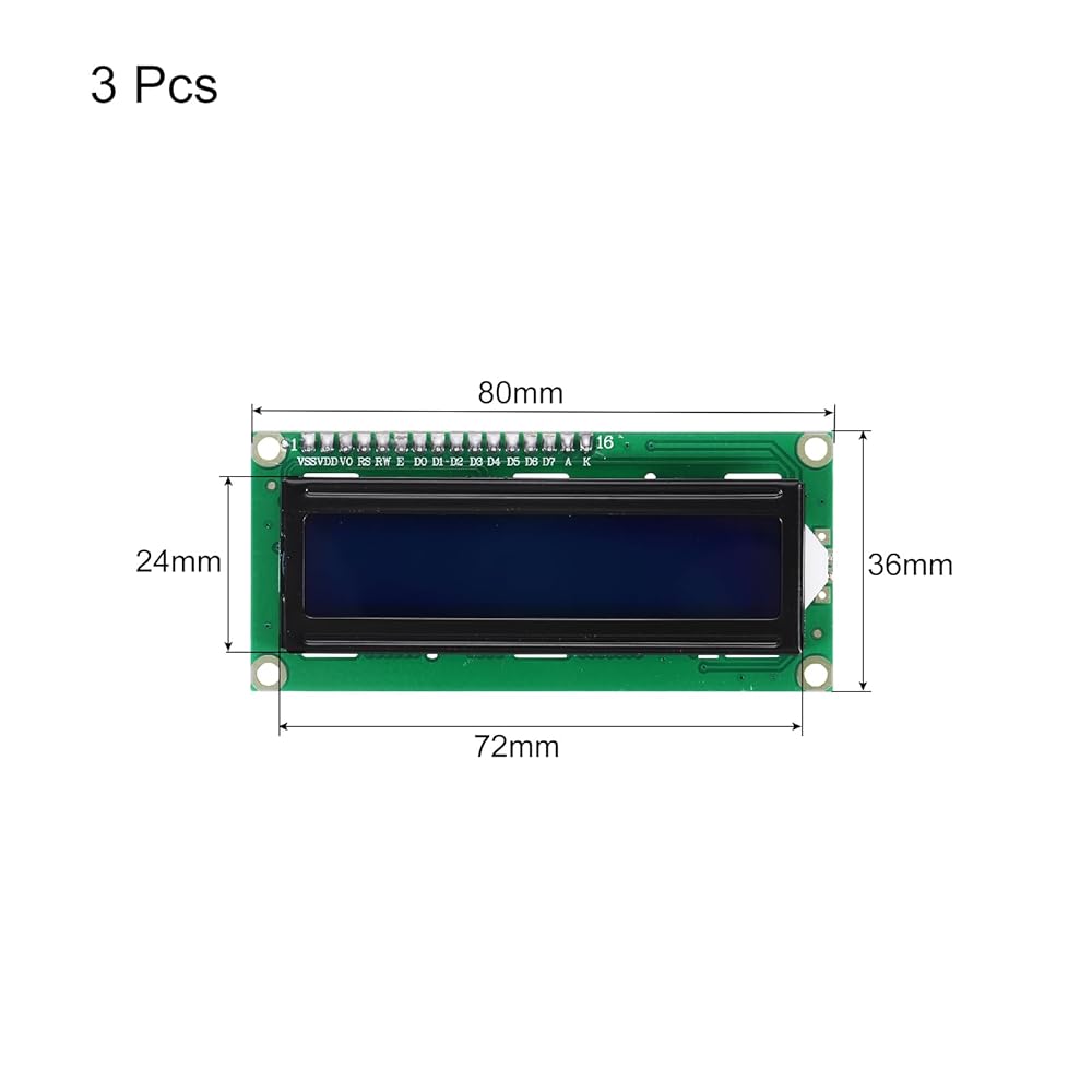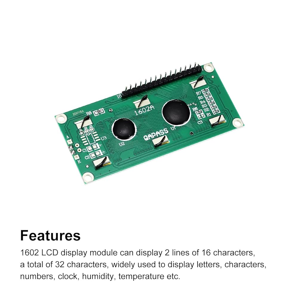 1602 LCD display module can display 2 lines of 16 characters, a total of 32 characters, widely used to display letters, characters, numbers, clock, humidity, temperature etc.