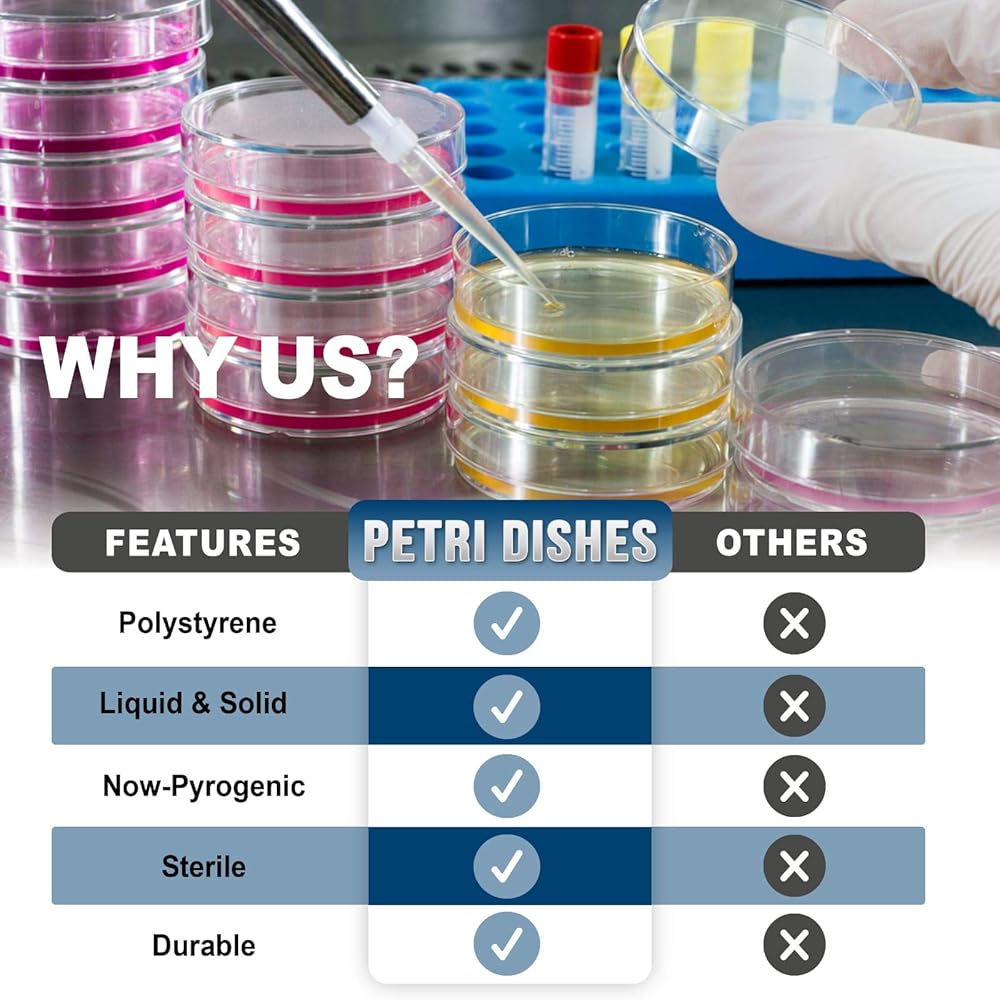 جودة بلاستيكية استثنائية: تتضمن كل حزمة أطباق بتري بلاستيكية عالية الجودة مع أغطية آمنة ، مما يوفر وضوحًا ومتانة لا مثيل لها.
