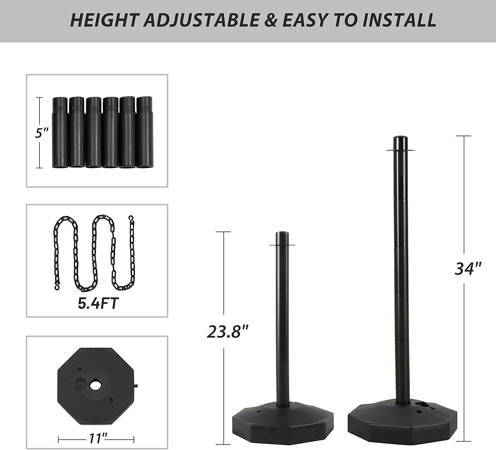 التجميع السهل والارتفاع القابل للتعديل: من السهل جدًا تثبيت Stanchion التحكم في الحشد ويمكن القيام به يدويًا بدون أي أدوات. بالإضافة إلى ذلك ، يمكنك ضبط مخاريط حركة المرور من 23.8 "إلى 34" عن طريق تشديد أو تخفيف أنابيب وفقًا لاحتياجاتك.