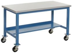 Heavy Duty Mobile Lab Bench Plastic Laminate Top with Safety Edge Used daily in laboratories across the country, this quality lab bench is supported by 2 heavy duty square legs made of 14 gauge tubular steel. The 36H fixed legs are ideal for schools, factories and more. 2000 lbs. capacity. The plastic laminate top stands up to heavy duty daily use and features a radius edge for added security. Includes 5 phenolic swivel casters with brakes for mobility to your bench and locking capability. The base has a blue powder coat finish. Quick and easy assembly. 1 year limited warranty. Customize your workbench with: Stackable steel drawer with cylinder lock to secure valuables Vertical kit to support light kit and overhead cantilever shelves 8 or 16 outlet power strip. Features. 60 x 36 in. Plastic Safety Mobile Lab Bench - Blue. Plastic Laminate Safety Edge Specs. Depth: 36. Mounting: Unassembled. Height: 36. Top Color: Light Gray. Wheel Type: Phenolic. Color Finish: Blue. Capacity Lbs: 2000. Wheel Diameter Inches: 5. Top Construction: Plastic Laminated Safety Rim. Construction: Steel. Width: 60. Height (Fixed Leg): 36