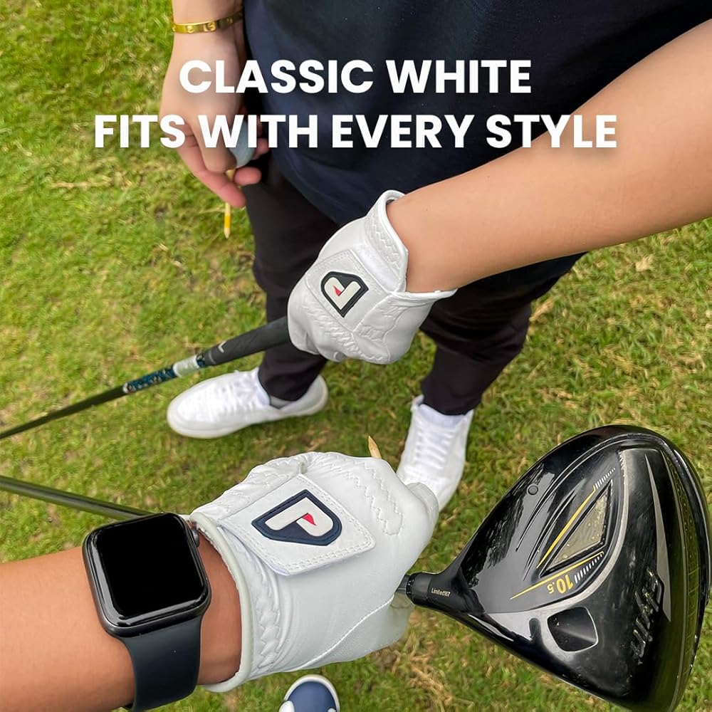 100% Cabretta leather golf glove for men. Golf glove options available for left hand and right hand golfers. Product comes with choice of red, white, and blue cabretta leather golf gloves with a ball marker. Ultra soft 100% cabretta leather for maximum comfort, style and function. Designed to last long, provide grip on golf clubs, and breathability to keep hands cool. Fits true to size