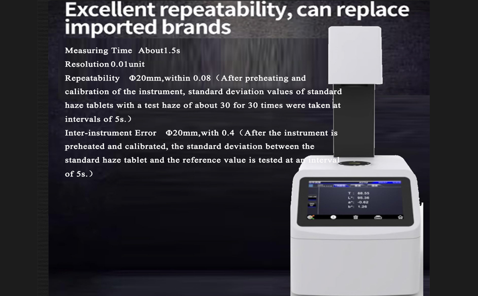 • 1. Digital Haze Meter {Double Standard ISO & ASTM} --------------- قادر على تلبية المتطلبات المعيارية للاختبار لمختلف المستخدمين ، وفقًا لـ ASTM D1003/1044 ، ISO 14782 ، GB/T 2410 ، JJF 1303-2011 ، CIE 15.2 ، JIS K7105 ، JIS K7361 ، JIS K 7136