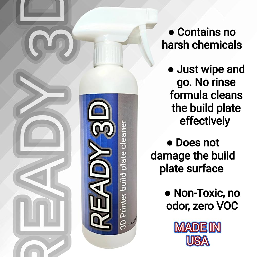 READY 3D printer build plate cleaner is formulated for use with READY 3D build plate adhesive. A machine washable 12"x12" microfiber cleaning cloth is included. Leaves the build plate cleand and ready for the next application of READY 3D build plate adhesive. Cleaner is primarily made from naturally derived and replenisabhe resources.
