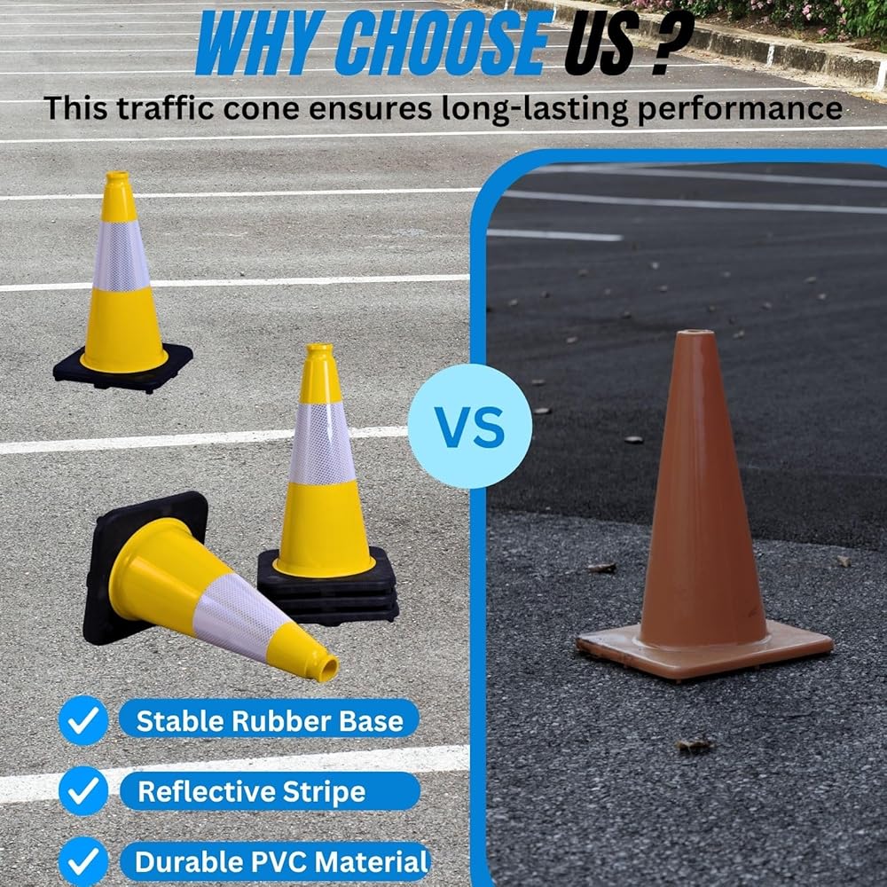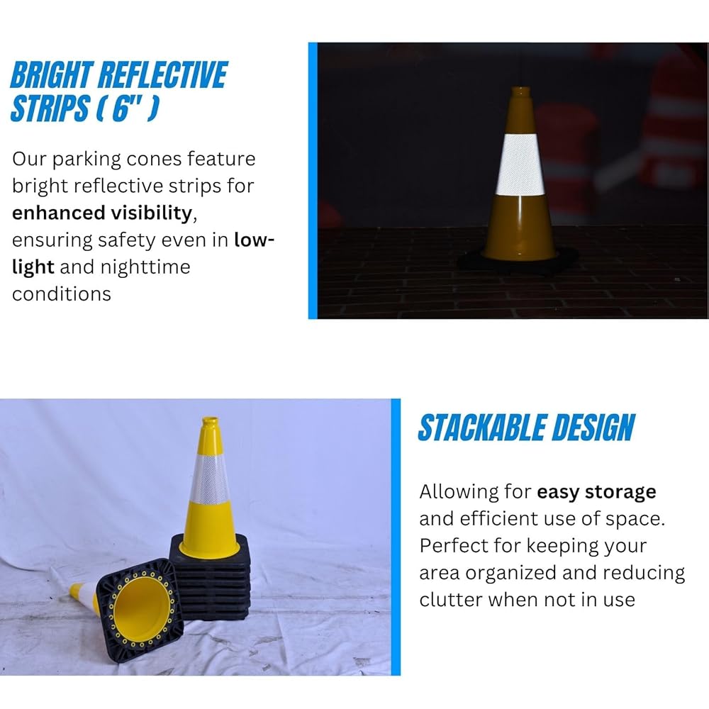 وضوح عالي: تتميز مخاريط مواقف السيارات الخاصة بنا 4 "شرائح عاكسة مشرقة لتعزيز الرؤية ، وضمان السلامة حتى في ظروف الإضاءة المنخفضة والليل