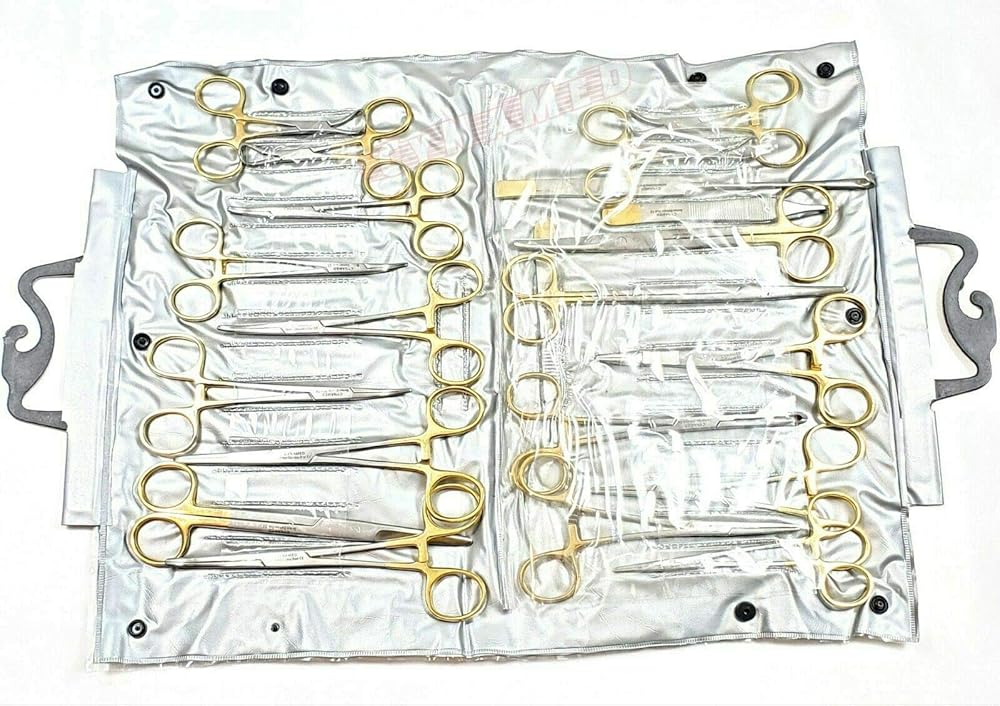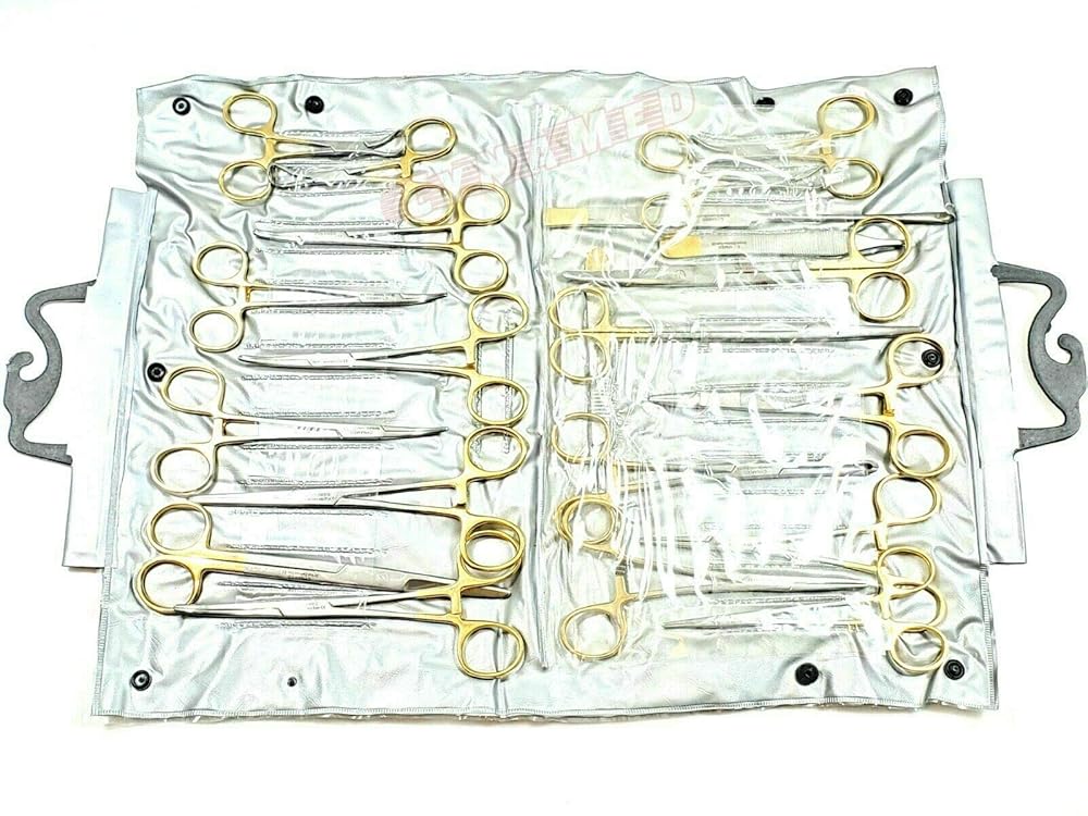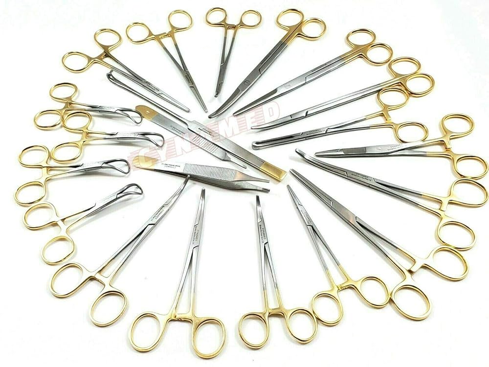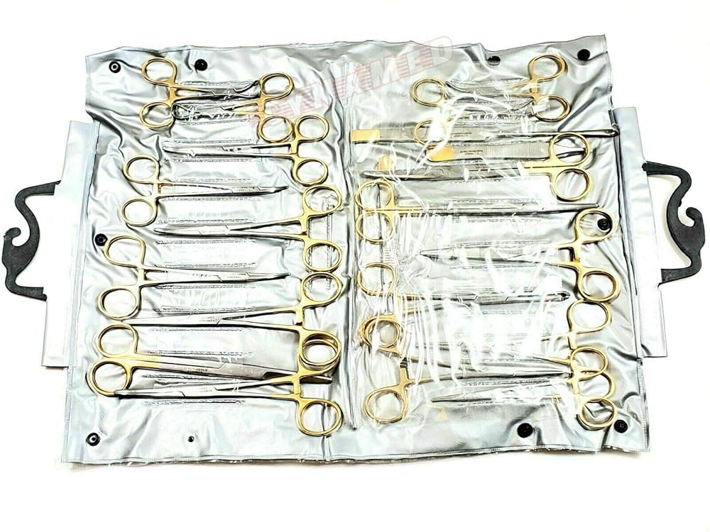 ITEM: Cynamed-Gold Premium German 82 Pcs Veterinary Instruments Set -Include Kelly Forceps- Mosquito Forceps -Carmalt Forceps -Backhaus Towel Clamp- Mayo Metzenbaum Scissors- All in ONE -SURGICAL DENTAL INSTRUMENT SET SET INCLUDES: 1 O.R GERMAN GRADE OLSEN HEGAR NEEDLE HOLDER 5.5" ( GOLD ) 1 O.R GERMAN GOLD HANDLE CARMALT ARTERY FORCEPS 6.25" STRAIGHT 1 O.R GERMAN GOLD HANDLE CARMALT ARTERY FORCEPS 6.25" CURVED 1 O.R GERMAN GRADE ALLIS TISSUE 4X5 TEETH 7" ( GOLD ) 4 O.R GERMAN GRADE BACKHAUS TOWEL CLAMP 3.5" ( GOLD ) 1 O.R GERMAN GRADE SCALPEL HANDLE #3 ( GOLD ) 1 O.R GERMAN GRADE SCALPEL HANDLE #4 ( GOLD ) 1 O.R GERMAN GRADE MOSQUITO HEMOSTAT FORCEPS 5" STRAIGHT ( GOLD ) 2 O.R GERMAN GRADE MOSQUITO HEMOSTAT FORCEPS 5" CURVED ( GOLD ) 2 O.R GERMAN GRADE KELLY HEMOSTAT FORCEPS 5" STRAIGHT ( GOLD ) 2 O.R GERMAN GRADE KELLY HEMOSTAT FORCEPS 5" CURVED ( GOLD ) 1 O.R GERMAN GRADE SNOOK OVERIECTOMY HOOK 8" ( GOLD ) 1 O.R GERMAN GRADE METZENBAUM SCISSORS 9" CURVED ( GOLD ) 1 O.R GERMAN GRADE MAYO DISSECTING SCISSORS 6.75" STRAIGHT ( GOLD ) 1 O.R GERMAN GRADE MAYO DISSECTING SCISSORS 6.75" CURVED ( GOLD ) 1 O.R GERMAN GRADE ADSON BROWN FORCEPS 4.75" SERRATED ( GOLD ) 20 SURGICAL STERILE BLADE #10 20 SURGICAL STERILE BLADE #11 20 SURGICAL STERILE BLADE #22
