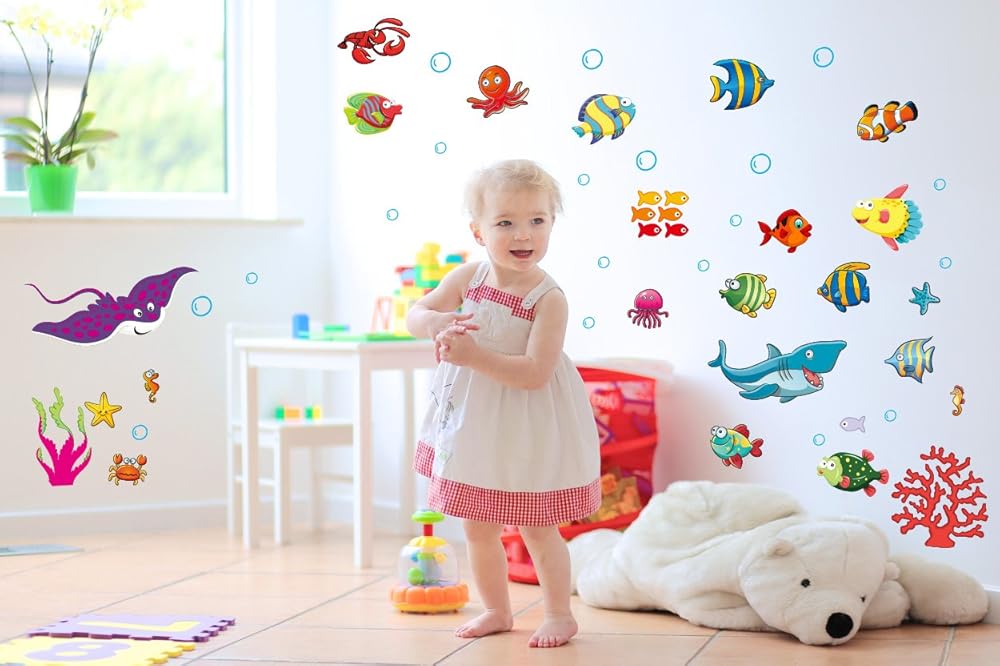 💖 أفضل ملصقات حائط على شكل سمكة للأولاد والبنات - مناسبة للجنسين ويمكن وضعها في حمام البنات أو الأولاد أو غرفة النوم حتى في حضانة الأطفال. هدية مثالية للأم الجديدة وستصبح أمهات قريبًا أو لحفلات استقبال المولود أو في أعياد الميلاد فقط. قدم حب الشاطئ والطبيعة والحياة البرية للأطفال في الهالوين أو الكريسماس أو أي عطلة أخرى. يمكنك الحصول على لحظة ترابط رائعة أو يمكنك جعل أطفالك الأذكياء يزينون بأنفسهم.