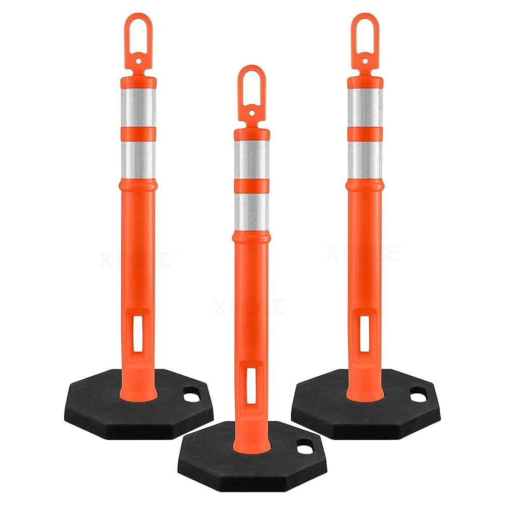 Make safety and visibility the #1 priority with Xpose Safety delineator posts. Delineator posts alert pedestrians and motorists of potential hazards and risks on the road. They're also used for directing traffic and crowd control at large events.PRODUCT FEATURES: 45 Inch Height 13 lbs Base Single Silver 10" Reflector High Visibility Orange T-Shaped Top Meets MUTCD SpecificationsHEAVY DUTY OCTAGONAL RUBBER BASEA 13 lbs. rubber base gives each post sturdiness and weightiness. Octagonal shape makes it less likely to blow over in heavy wind and rain.DAYTIME AND NIGHTTIME VISIBILITYHigh-visibility orange PE material makes it easy to see from afar during the day. A silver reflective band makes it instantly noticeable in the dark.UV-RESISTANT CONSTRUCTIONUV stabilizers in the PE material mean these stanchions are resistant to fading and brittleness due to exposure.MEETS MUTCD SPECIFICATIONSThe Manual on Uniform Traffic Control Devices for Streets and Highways (MUTCD) defines the standards used by road managers nationwide to install and maintain traffic control devices on all public streets, highways, bikeways, and private roads open to public travel.Overcome workplace hazards and dangerous job site challenges with the reliable safety and security of Xpose Safety.