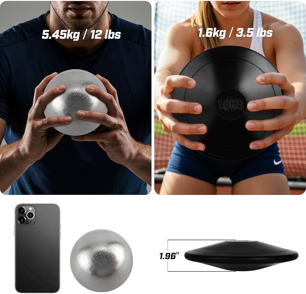 【Durable All-Weather Use】Weather-resistant cast iron shot put and anti-slip rubber discus withstand indoor/outdoor training sessions, suitable for PE classes, school sports days, and backyard practice.