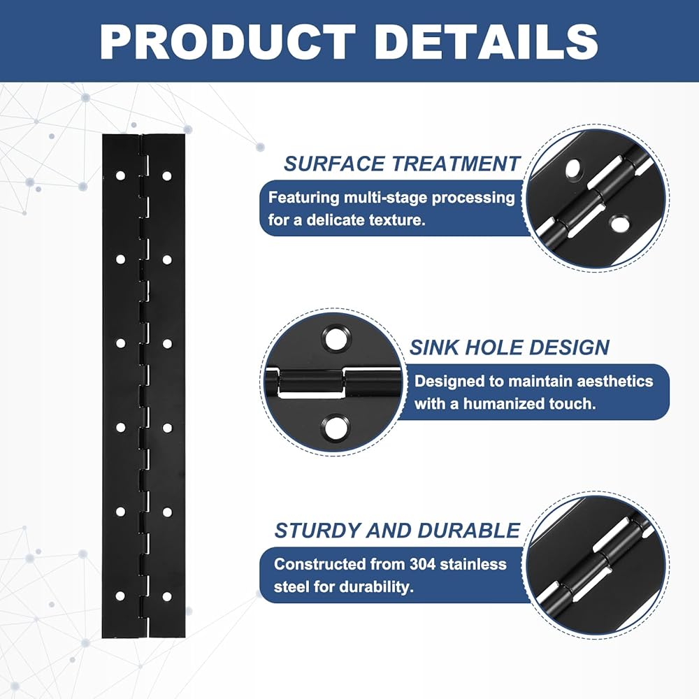 • الميزة: تتكون المفصلات المستمرة من 304 من الفولاذ المقاوم للصدأ مع سطح مصقول ، وهو مقاوم للصدأ ودائم لتجنب الاختلال. كل رابط هو نقطة تحمل المفصلات المستمرة ، مما يوفر قوة موحدة وعمل محوري ناعم ؛ دبوس من نوع الاحتكاك ثابت ودائم.
