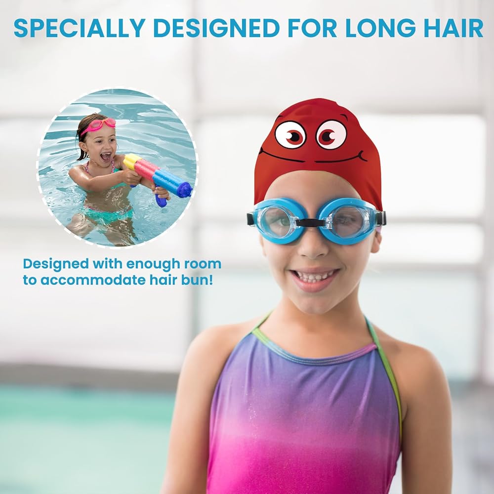 تم تصميم قبعة السباحة للأطفال خصيصًا بحجم كبير جدًا لغرفة واسعة ، بحيث يكون لديها مساحة كافية لتناسب رأس كبير وأي تسريحة شعر ضخمة: شعر مجعد ، شعر طويل ، ضفائر ، مجدل ، مامبو الكروشيه ، ملحقات ، نسج على الشعر الأفرو. غطاء السباحة للضفائر والنساء المجدلات