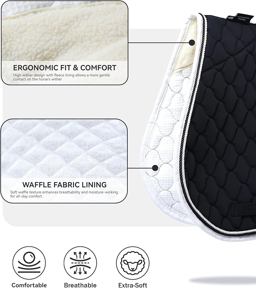ملاءمة آمنة: شكل تشريحيًا مع العمود الفقري المحيط (جزء ذبل مبطن مع الصوف الفخم) لمنع الانزلاق وضمان بقاء وسادة السرج الإنجليزي في مكانه أثناء ركوب الخيل.