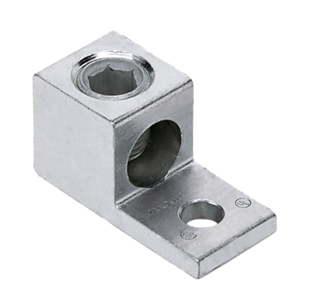 This versatile electrical aluminum mechanical lug is engineered for both copper and aluminum wire applications, offering exceptional flexibility in electrical installations. Accommodating conductor sizes from #250 to #6 AWG, this single-port lug features a 5/16-inch bolt mounting hole for secure attachment. The tin-plated finish enhances conductivity and provides corrosion resistance, ensuring reliable long-term performance. The lug's robust construction makes it ideal for various electrical connections in both residential and commercial settings. Its single-port design simplifies installation while maintaining a strong, dependable connection. This dual-rated lug is designed to meet rigorous industry standards and comes UL Listed, making it suitable for use in a wide range of electrical applications where reliable termination is crucial.