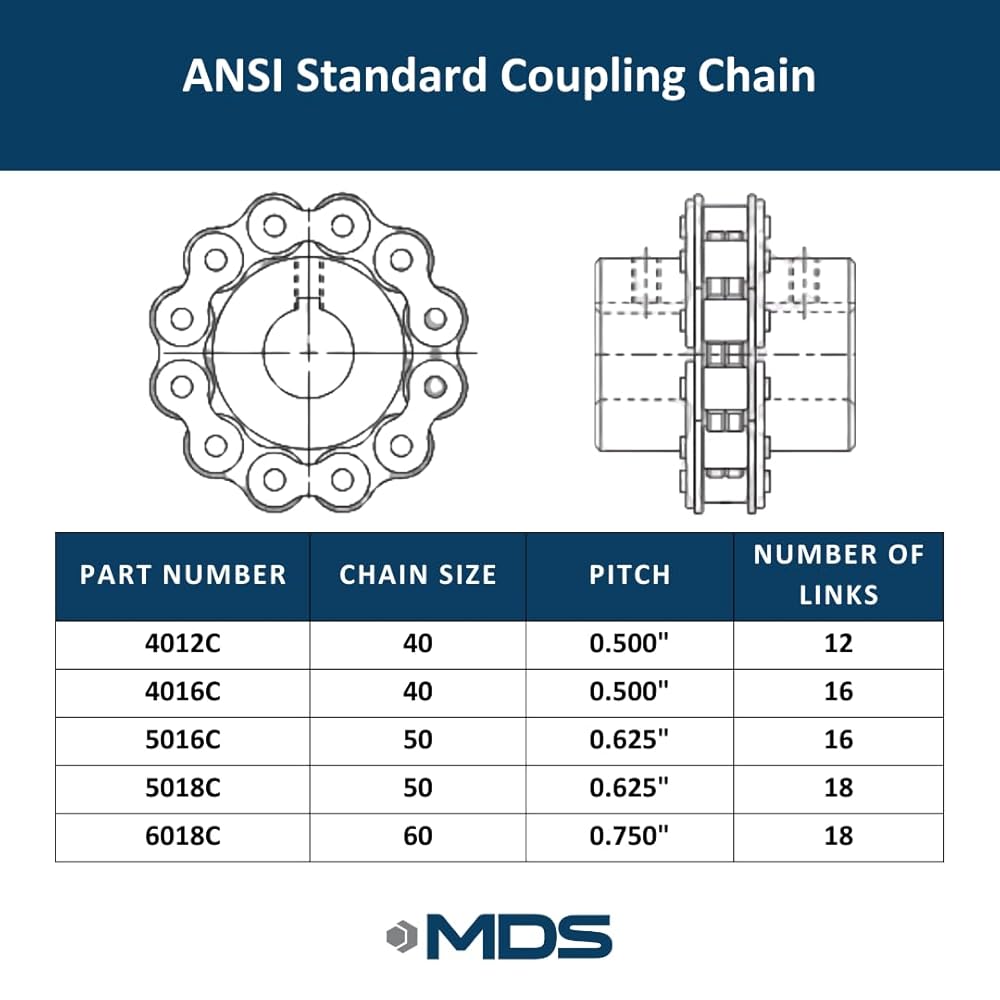 The 5018 coupling chain is manufactured using high-quality precision heat-treated carbon steel for maximum strength, durability and performance, to meet meets all ANSI standards. It includes a connecting link to fully attach. For use with taper bushed, QD and stock, and finished bore roller-chain style couplings (sold separately).