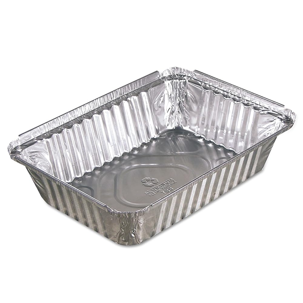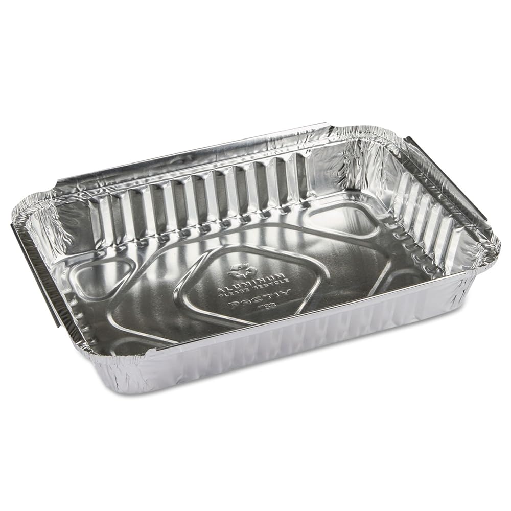Versatile food pans may be used for cooking, reheating, serving or takeout. Rigid, sturdy aluminum provides reliable use-once performance. For use with appropriately sized Pactiv Flat Foil-Laminated Food Container Lids. Food Container Type: Cooking/Baking Pan; Material: Aluminum; Capacity (Volume): 25.000 oz; Color: Aluminum.