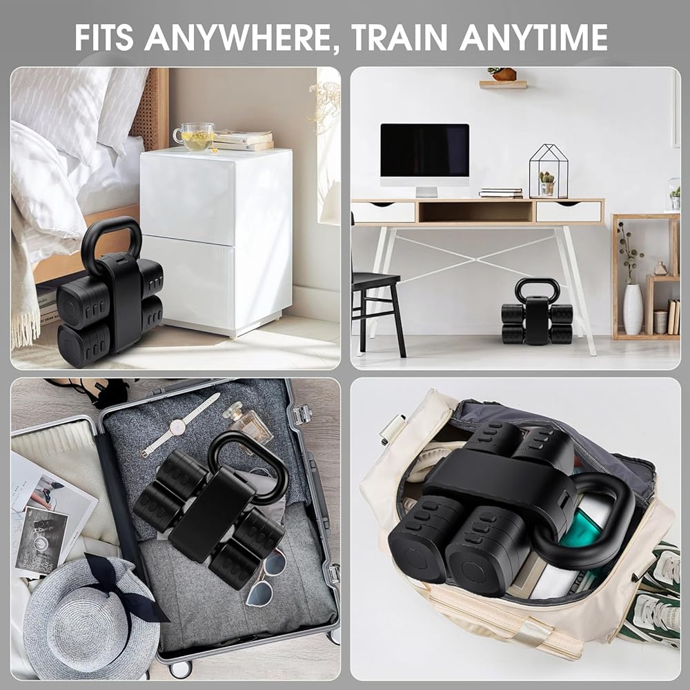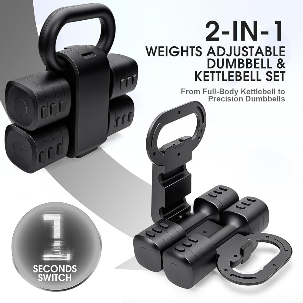 【Convertible Adjustable Dumbbell and Kettlebell】Easily switch between a full-size kettlebell for full-body training and two adjustable dumbbells for focused workouts. The smart interlocking system makes conversion quick and secure—no extra tools or loose parts needed.