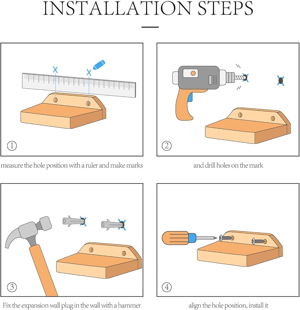 التركيب: يحتوي كل رف على فتحتين لولبية مثقوبة مسبقًا، وهو مجهز بمسامير ومسامير تثبيت وتعليمات لتسهيل التركيب. إنه خيار جيد لتثبيتها في أي مكان.