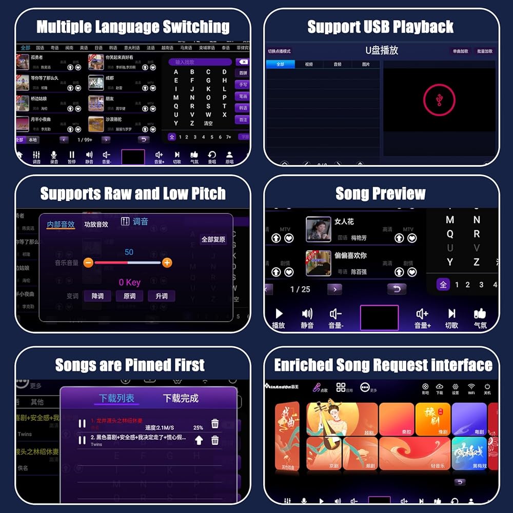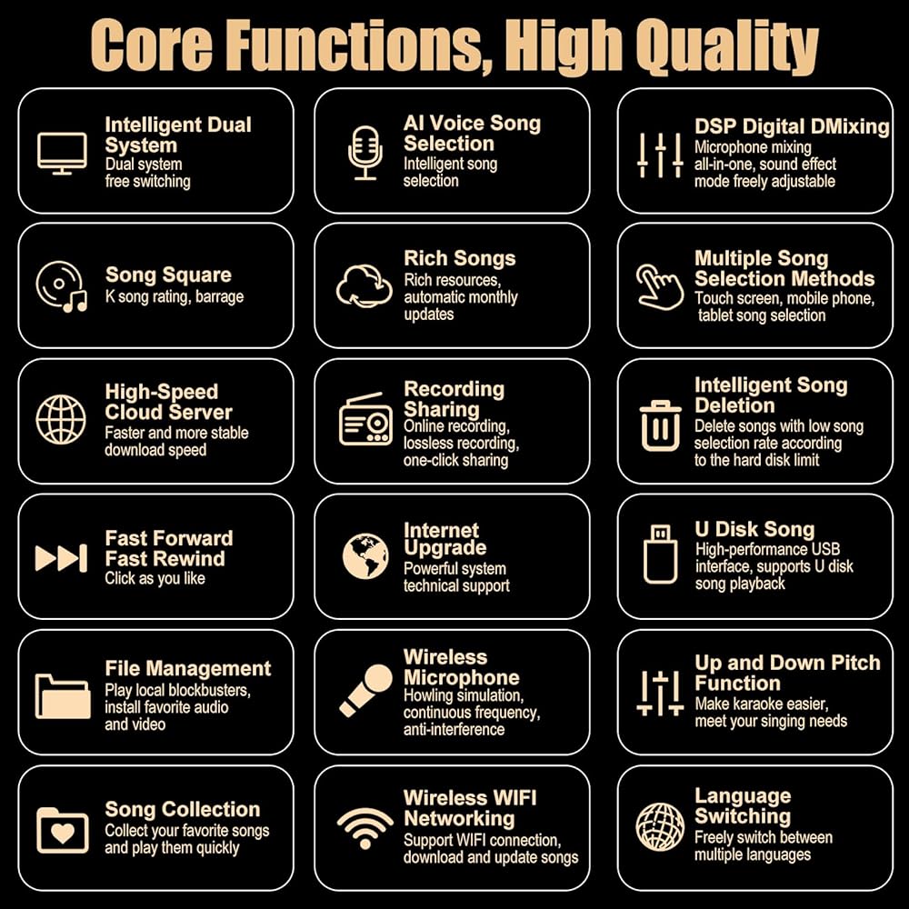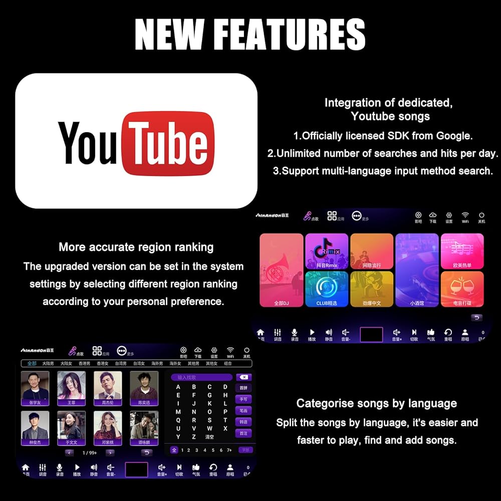 (Features) System output resolution: 19.5-inch latest capacitive screen 4k. Real 3D effect, super visual enjoyment! Support dual HDMI+VGA screen, HDMI output; dual decoding function, let you preview a song you play. The latest 4-in-1 design Built-in wireless microphone and pre-mixer Easier to use "Video picture" function design, let you watch TV and watch videos. Select language song, song title, artist name, index number,