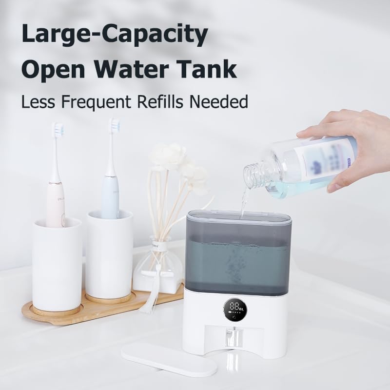 • 2️⃣ 𝟒 𝐀𝐝𝐣𝐮𝐬𝐭𝐚𝐛𝐥𝐞 𝐃𝐨𝐬𝐚𝐠𝐞 𝐌𝐨𝐝𝐞𝐬 + 𝐋𝐄𝐃 𝐒𝐦𝐚𝐫𝐭 𝐃𝐢𝐬𝐩𝐥𝐚𝐲: Customize rinses for kids or adults with 4 precision modes (10ml/15ml/20ml/Unlimited)—triggered by a double-tap on the touch-sensitive panel. The HD LED screen shows real-time battery life, water level, and selected dose, while the 500ml transparent tank makes refills and cleaning effortless. (Ideal for travel-sized cups or deep-cleaning routines!)