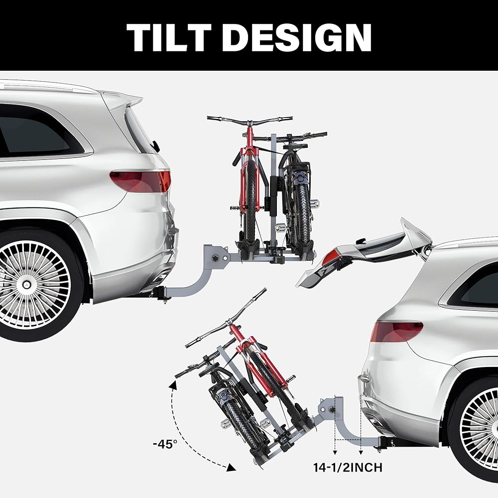 قابلة للطي وقابلة للإمالة: من السهل تجميع رفوف الدراجة الخاصة بالدراجات وتركيبها على عاتق ، عندما لا تكون قيد الاستخدام ، يمكن طيها لتوفير المساحة. يتيح لك البناء الخاص القابل للإمالة فتح الجذع دون إزالة رف الدراجة ، فقط بحاجة إلى إمالةه لأسفل