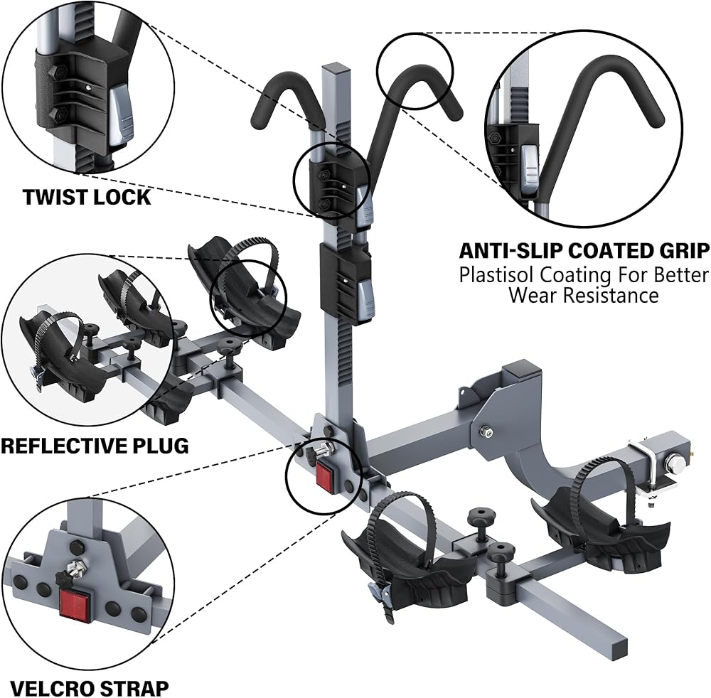 عالمي وقابل للتعديل: يحتوي رف الدراجة هذا لـ Hitch على خطافات قابلة للتعديل لعقد إطار للدراجات ، كما أن حاملي الإطارات القابلة للتعديل مع الأشرطة الفيلكرو الثقيلة يمكن أن يصلح بأحجام مختلفة من الدراجات والإطارات ، وسدادات عاكسة حقيقية في نهاية الأمر تجعل القيادة أكثر أمانًا في الليل