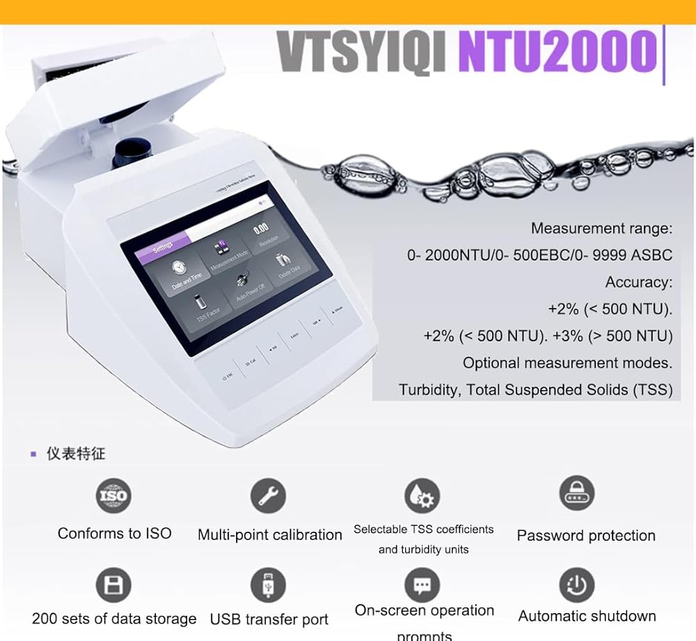 اختبار التعكر التعكر الرقمي مقياس TSS مع تحليل الجسيمات المعلق من 0 إلى 2000 NTU/FNU 0 إلى 500 EBC 0 إلى 9999 دقة ASBC ± 2 ٪ 4 PCS حلول معايرة 2 إلى 7 نقطة معايرة