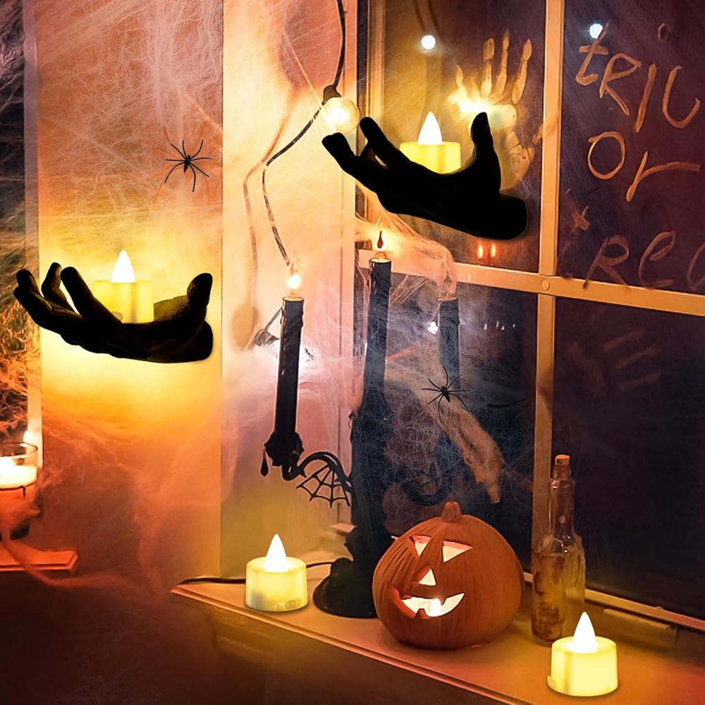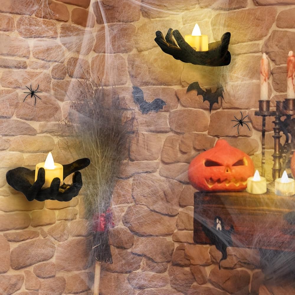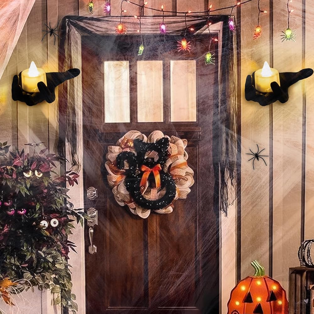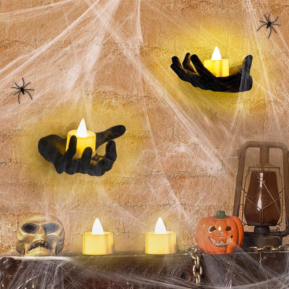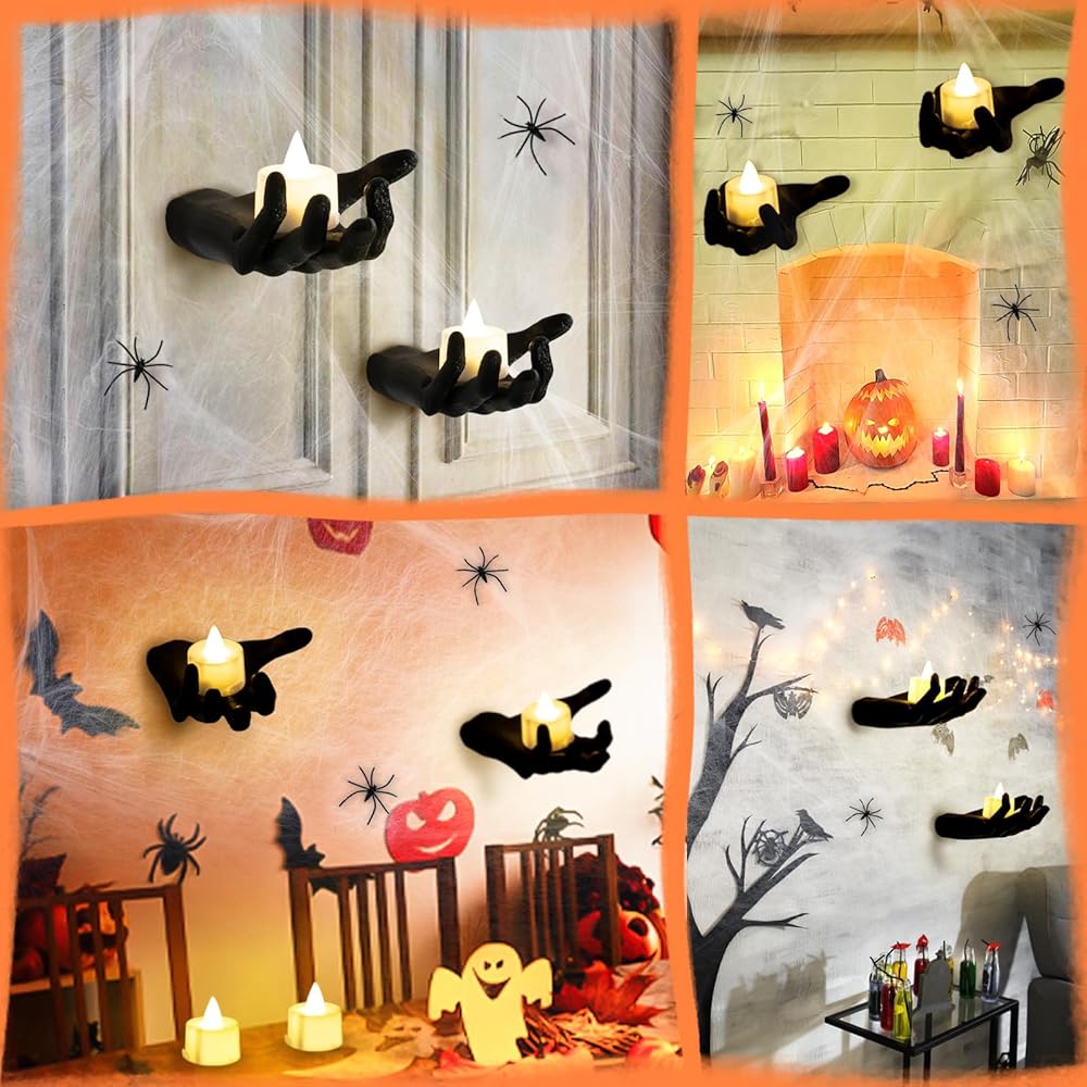 ديكورات الهالوين لديكور الحائط الداخلي - حوامل شموع الهالوين ذات هيكل عظمي أسود مع شبكات العنكبوت، 4 شموع LED للهالوين لديكور جدار المنزل الداخلي للهالوين