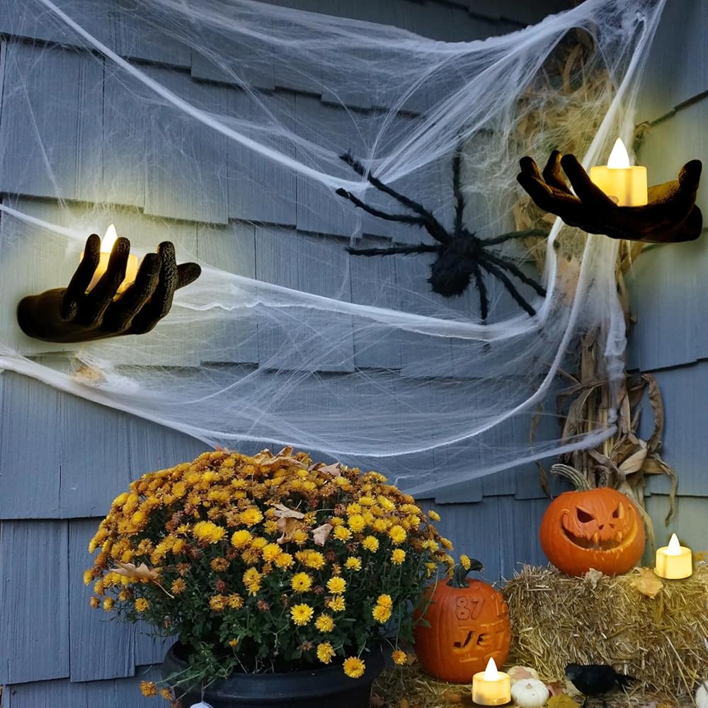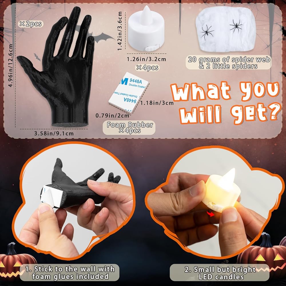 ✔【شمعة هيكلية فريدة من نوعها】سوف تحصل على قطعتين من حاملات شموع الهالوين ذات الأيدي الهيكلية السوداء، و4 قطع من شموع الهالوين LED، وشبكات عنكبوت 20 جرامًا، و4 قطع من الغراء الإسفنجي مقاس 0.8 بوصة × 1.2 بوصة. هذه الأيدي الهيكلية لديكور الهالوين أصغر من الأيدي البشرية المعتادة، ولكنها كافية لحمل شموع LED بثبات وإضاءة زينة الهالوين المخيفة لك.