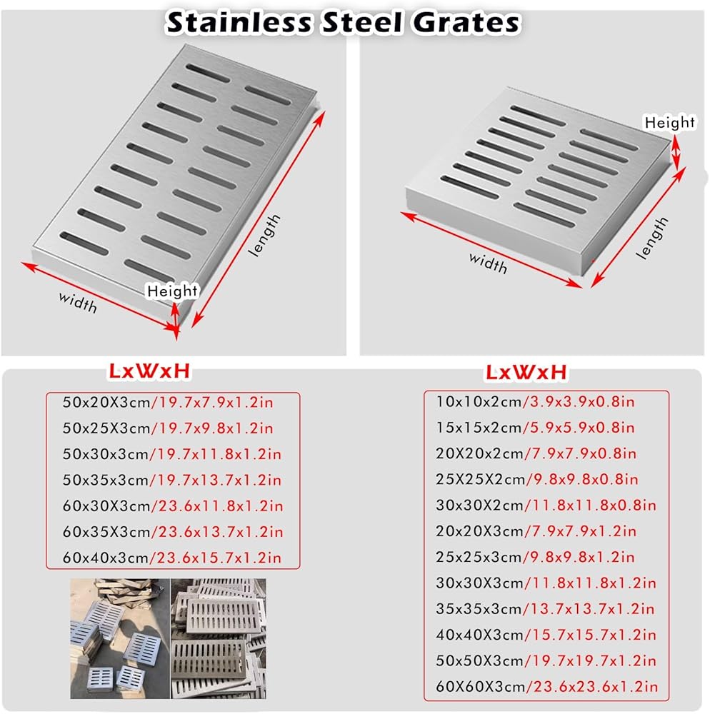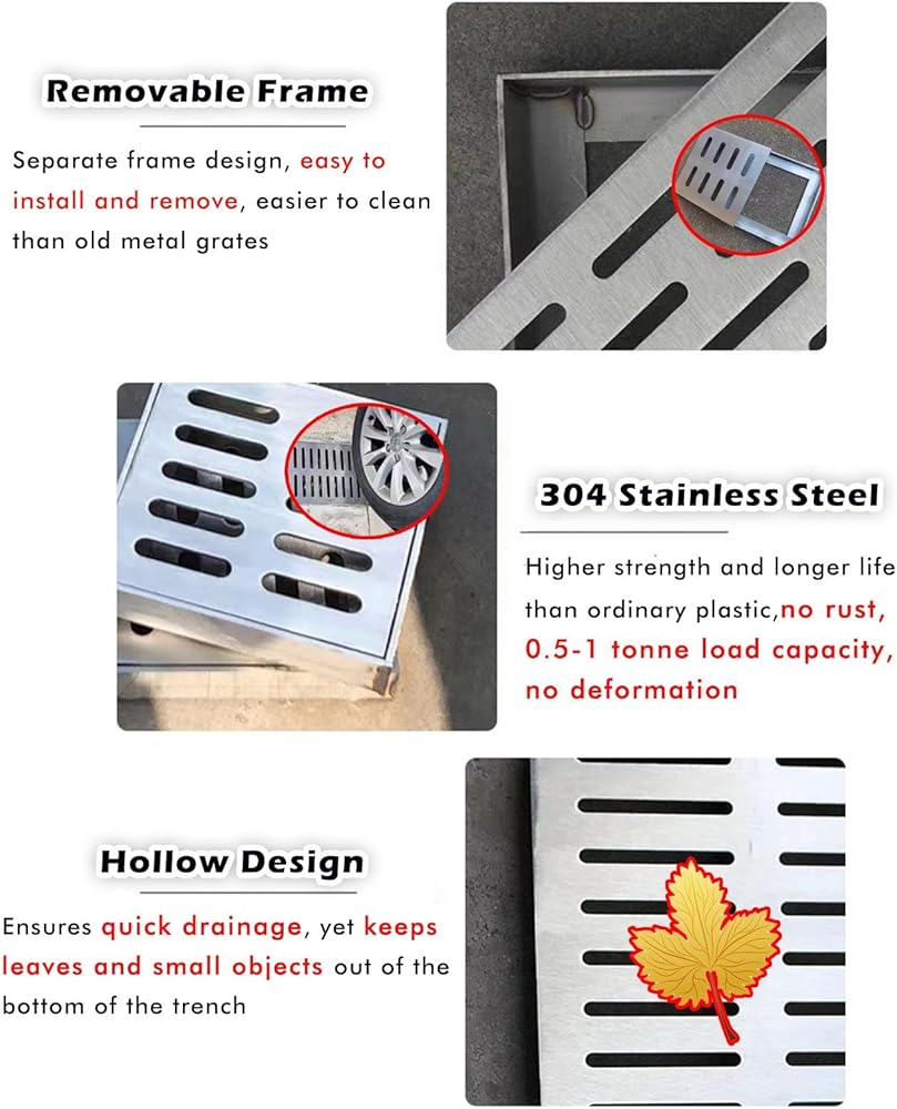 • 304 Stainless steel Drainage Covers: Made of 304 stainless steel, this metal drainage grate is resistant to abrasion and vehicle run-over, preventing standing water from damaging foundations, and this outdoor trench drain cover features a 2.5 cm/1 in. design that ensures efficient and safe drainage.