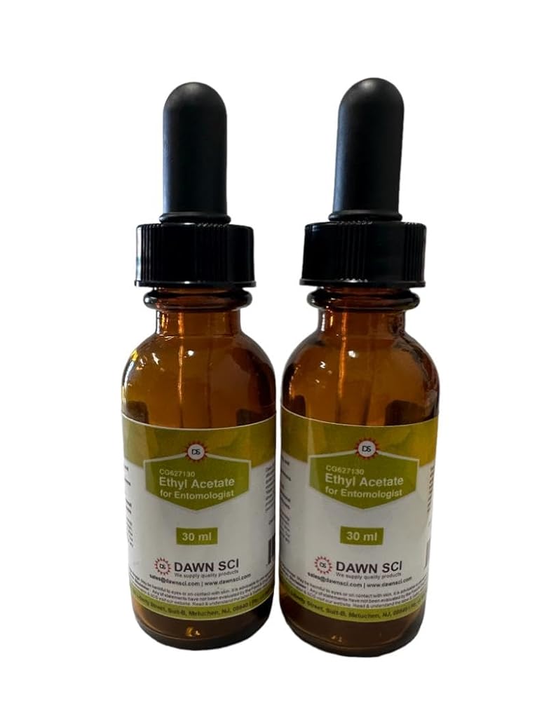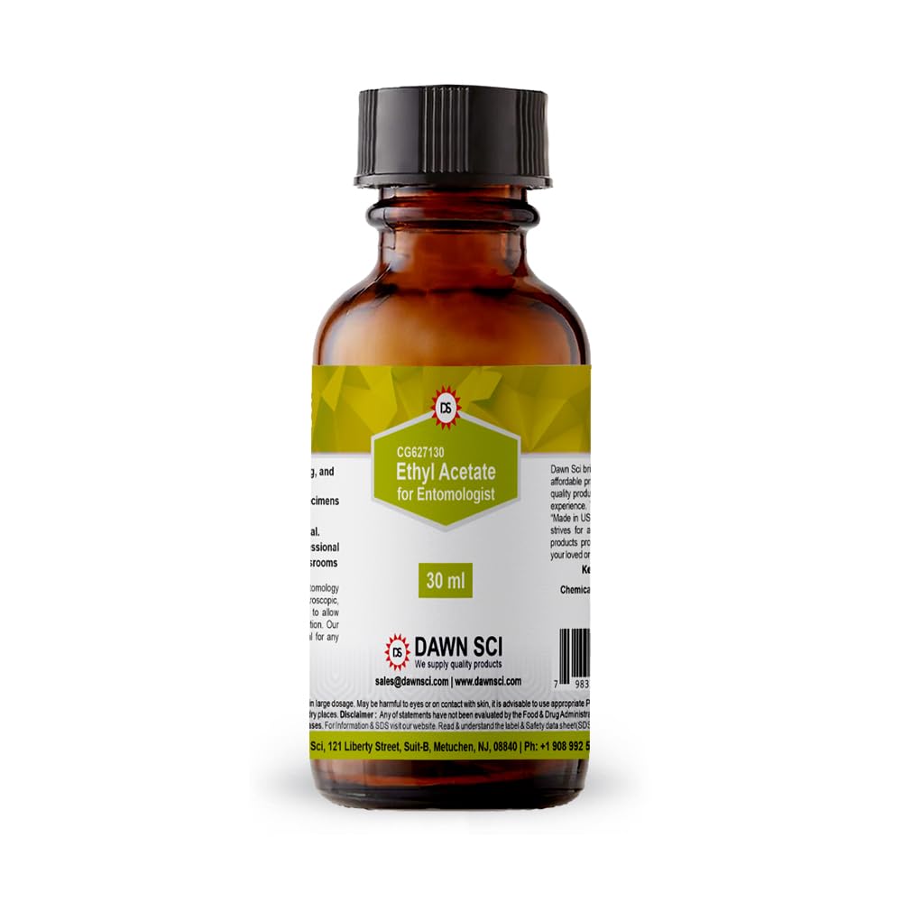 Ethyl Acetate for Entomology 30 mL – PACK OF TWO. Ethyl acetate is commonly used in entomology as a killing agent because it is not hygroscopic, and it keeps the insect soft enough to allow proper mounting suitable for a collection. Our premium quality Ethyl Acetate is ideal for any professional or amateur entomologist. DAWNSCI provides quality products at very compatative price
