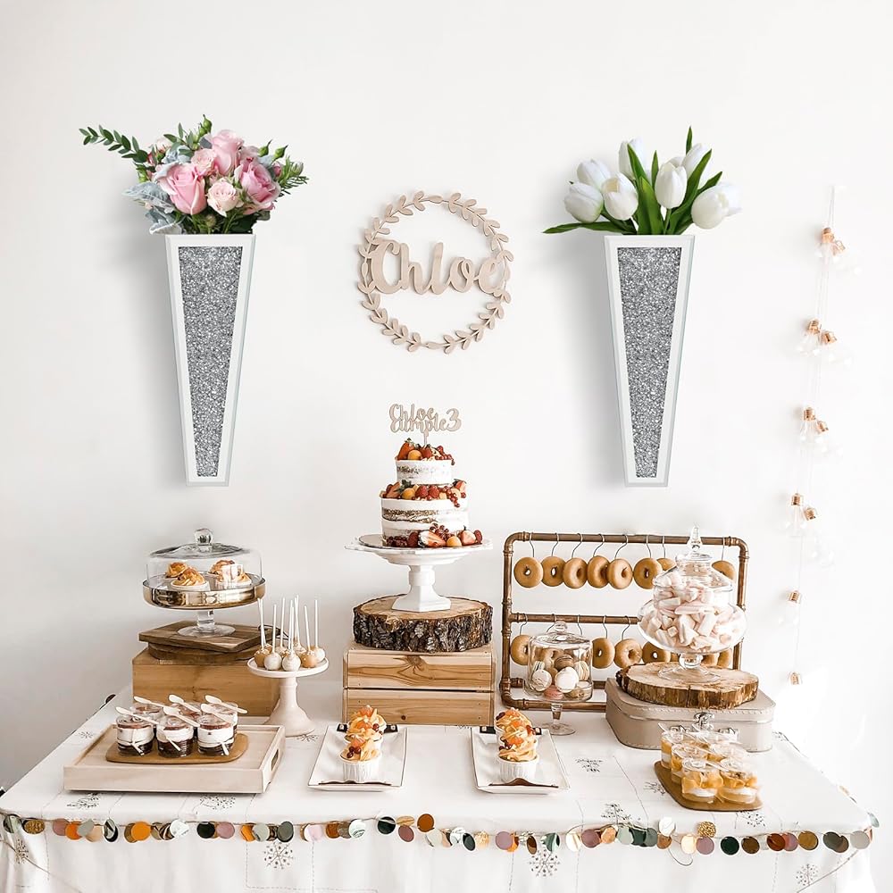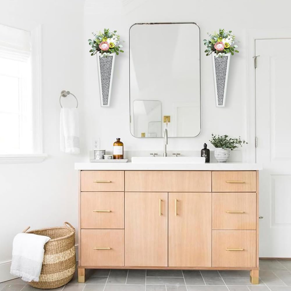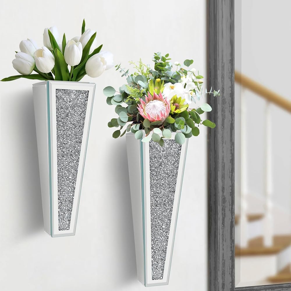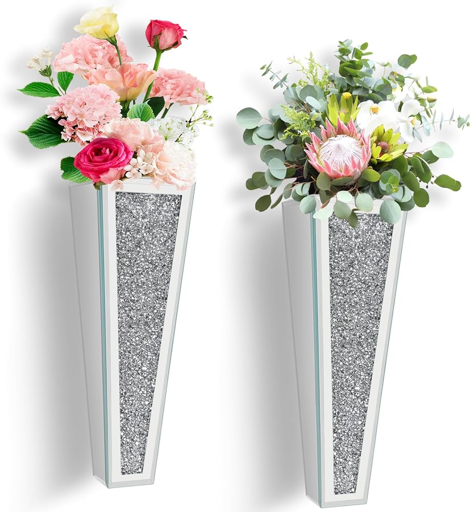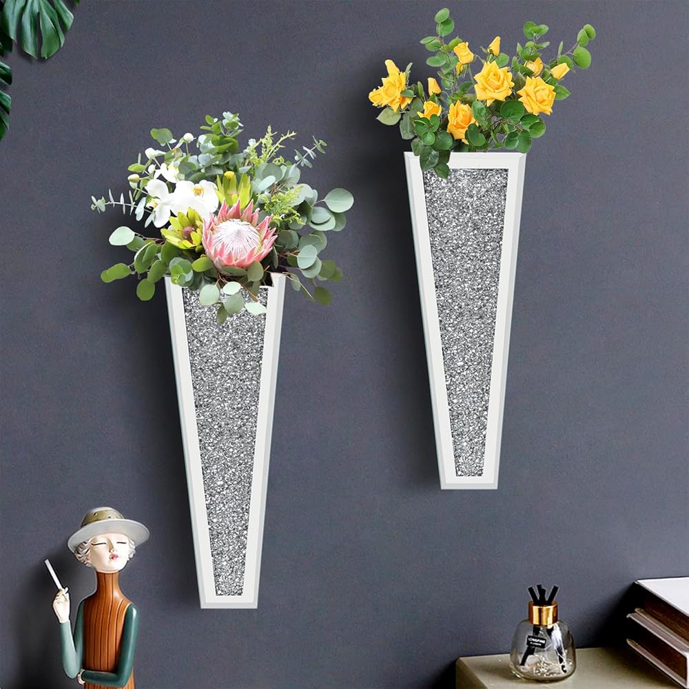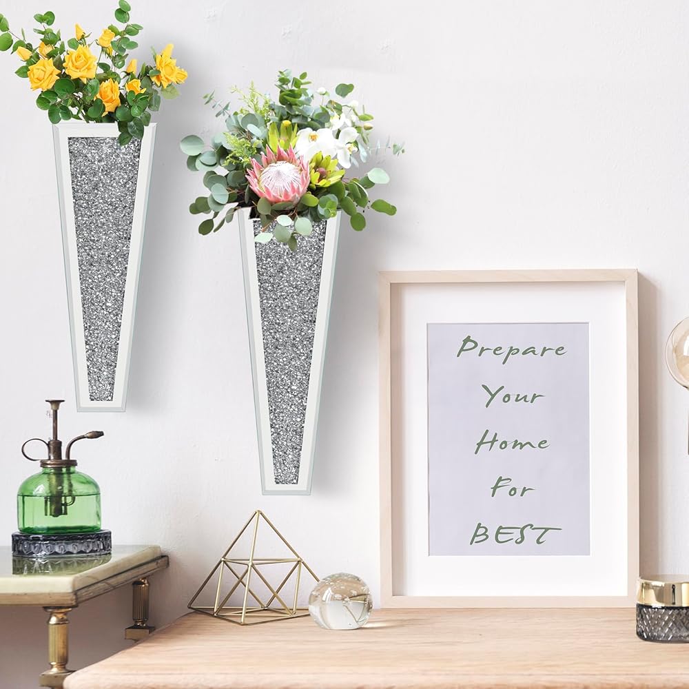 مجموعة مزهرية للزهور مكونة من قطعتين، مزهرية فضية معلقة على الحائط من الكريستال الماسي، مزهرية فضية للزهور والنباتات، ديكور منزلي فاخر لتزيين الحائط وغرفة المعيشة وغرفة النوم وغرفة الطعام