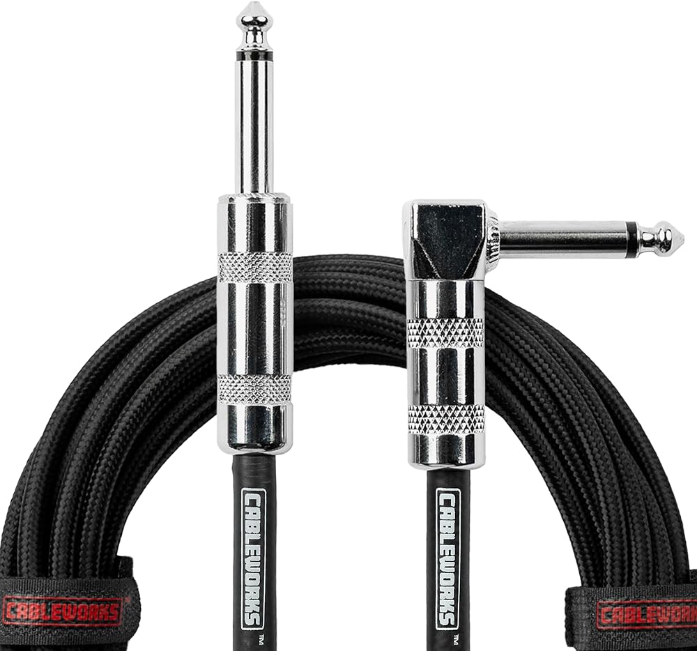 10-Foot Braided Instrument Cable: Straight to right angle design with classic 1/4" TS male connectors for secure, reliable connections.